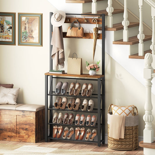 HOOBRO Hall Tree with Bench, Narrow Shoe Rack with Coat Rack, Coat Rack with Shoe Storage, 5 Tier Slanted Shoe Storage Organizer, Coat and Shoe Rack Entryway, Slim Hall Tree
