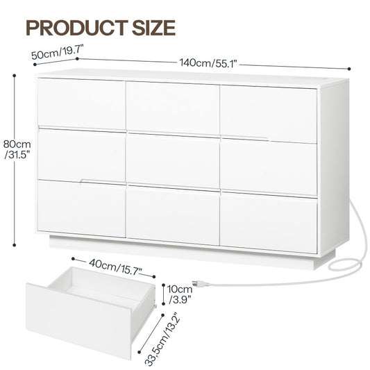 HOOBRO White Dresser for Bedroom, Handless 9 Drawers Dresser, 55'' Modern White Chest of Drawers with Charging Station and LED Light, Dressers Organizer for Bedroom, Living Room, Hallway