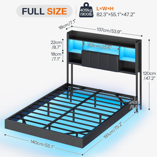 HOOBRO Full Size Floating Bed Frame with LED Lights and Charging Station, Upholstered Platform Bed Frame Full Size, Modern Metal Floating Bed Frame, No Box Springs Needed
