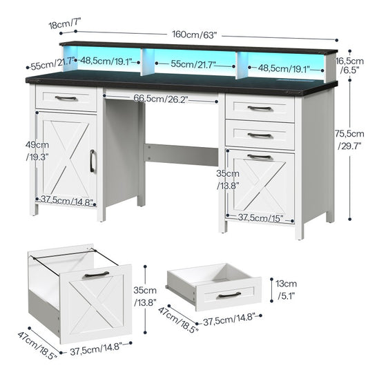 HOOBRO Farmhouse Office Desk with Drawers, 63" Long Computer Desks with File Drawers, Storage Cabinet, Home Office Gaming Desk with Power Outlet & Led Lights & Monitor Stand, Executive Desk