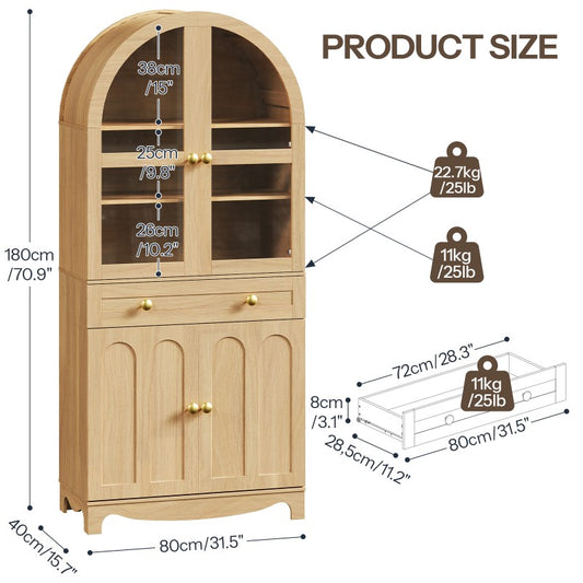 HOOBRO Arched Kitchen Pantry, 71" Tall Kitchen Pantry Cabinet with Drawer, Glass Door and Adjustable Shelves, Farmhouse Kitchen Storage Cabinet, for Living Room, Dining Room