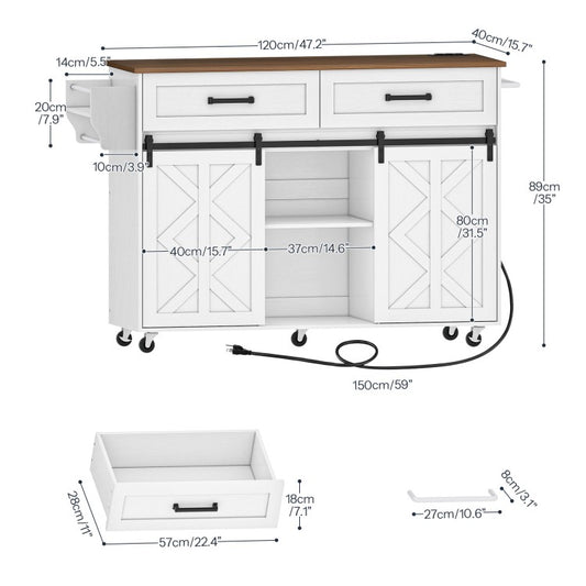 HOOBRO Kitchen Island with Power Outlet, Rolling Kitchen Island with Barn Doors, Kitchen Cart on Wheels, Kitchen Island Table with Drawer, Open Shelves, for Kitchen