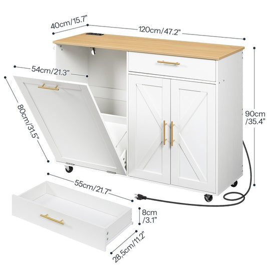 HOOBRO Kitchen Island with Trash Can Storage, 47" Rolling Kitchen Island Cart with Power Outlet & Drawer, Kitchen Carts on Wheels with Storage, Mobile Island Table