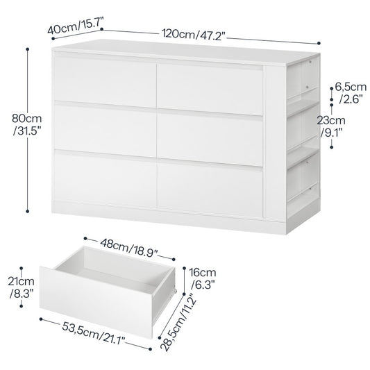 HOOBRO White Dresser for Bedroom, 6 Drawers Handleless Chest of Drawers for Closet, Wooden Storage Dresser with Side Display Shelf, Modern Chest of Drawers for Bedroom, White