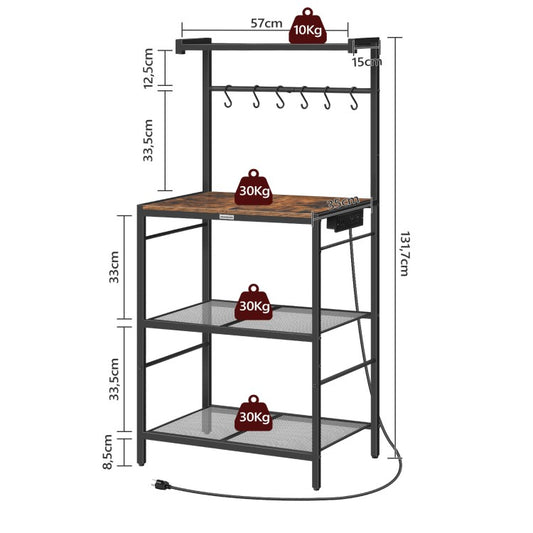 MAHANCRIS Bakers Rack with Charging Station, Microwave Stand with 6 S-Shaped Hooks, 4-Tier Storage Rack, Practical Coffee Bar, for Kitchen, Dining Room