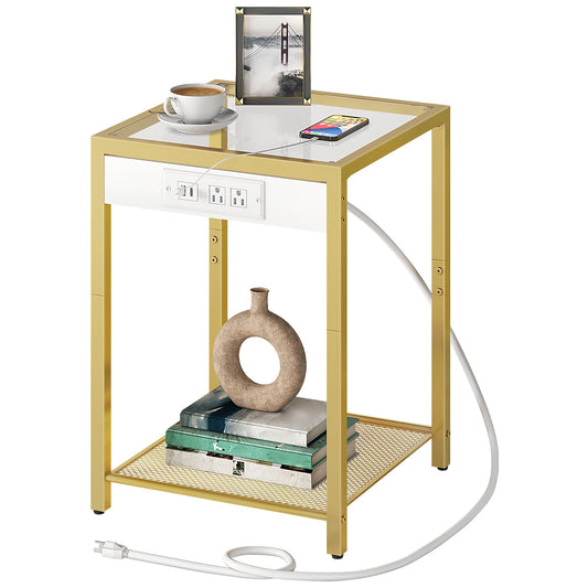HOOBRO Gold Modern Metal Frame Tempered Glass Desktop Side Table with USB Port & Charging Station / 2PICS