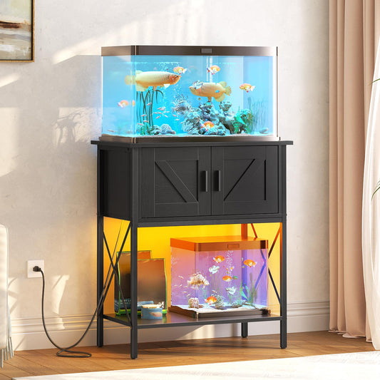 HOOBRO Black 20-Gallon Metal Frame Aquarium Rack with Power Outlet & LED Light Strip & Cabinet Storage