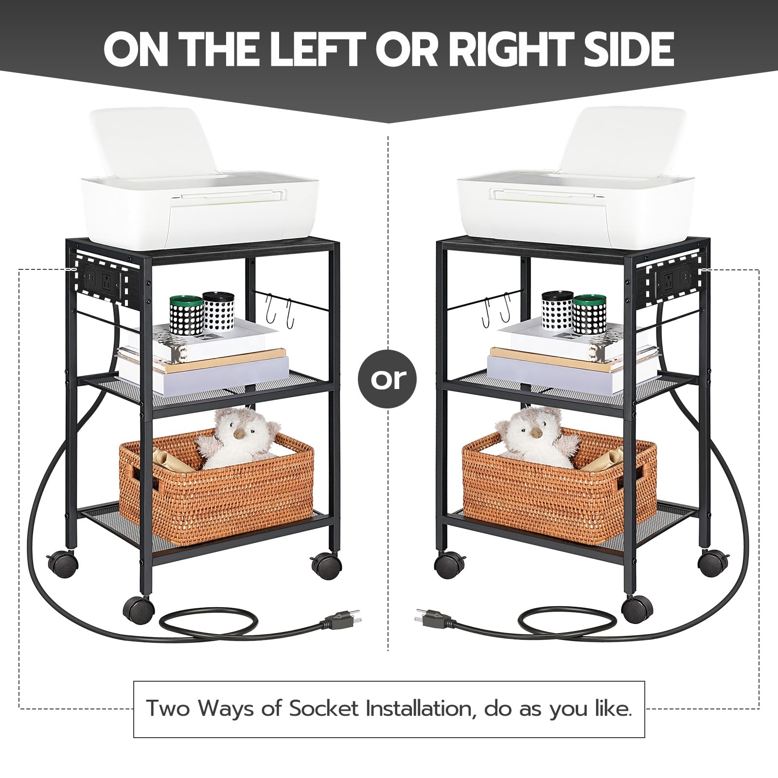 HOOBRO Black Industrial Style Three-Tier Movable Printer Stand with Wheels & Power Outlet & USB Port &2 Hooks