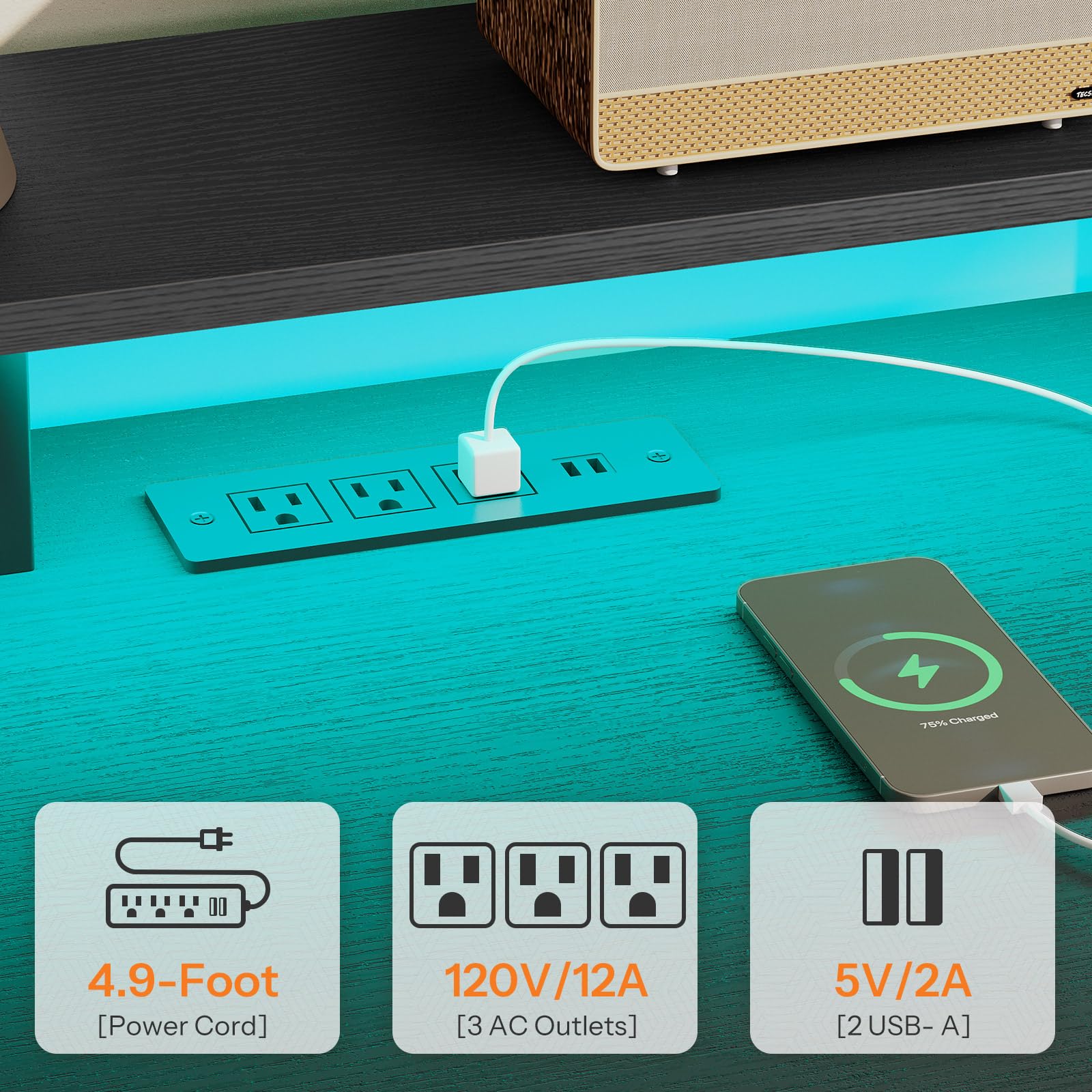 - Charging Station and LED Light: Built-in 3 AC outlets and 2 USB ports power various devices such as smartphones and gaming consoles. The LED light offers multi-mode control via a mobile app, syncing with music for a personalized working vibe