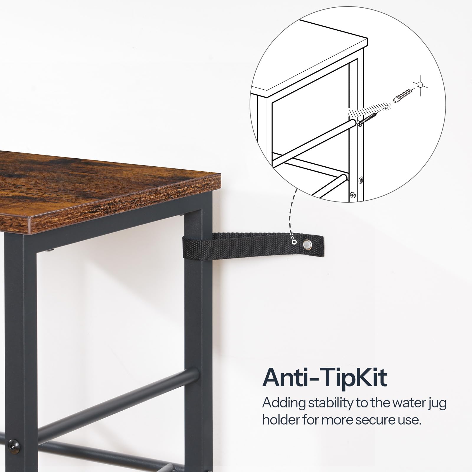- Premium Water Bottle Holder: This water jug stand is constructed of durable metal and particleboard, with an X-shaped metal bar on the back, adjustable feet and anti-tilt straps for enhanced stability. Water bottle holder has a maximum weight capacity of 231 lb