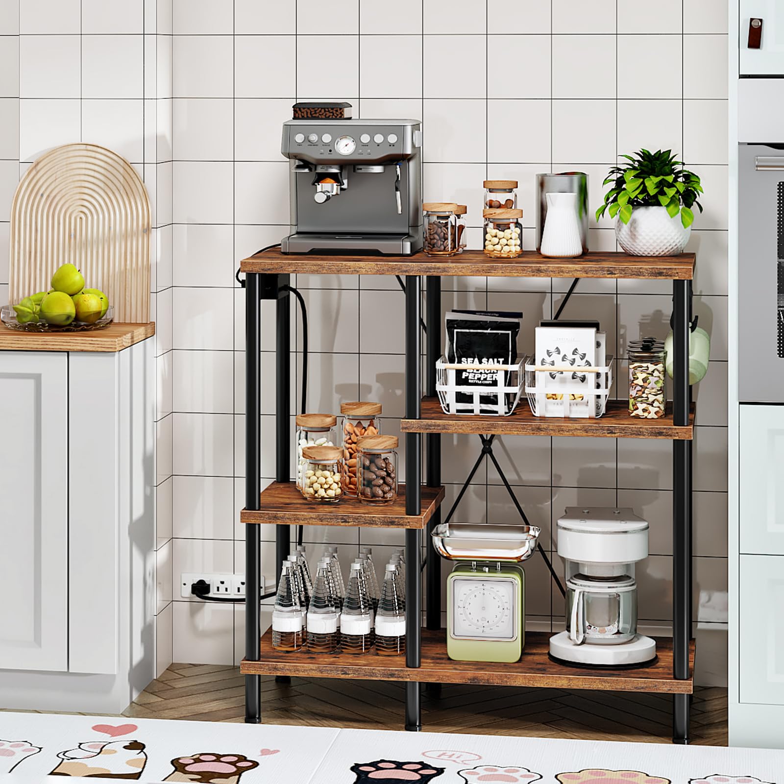 - Sturdy & Stable Structure: Rustic brown panel, classic black steel frame, X-shaped rod on the back, adjustable floor levelers, and anti toppling device in this coffee bar storage rack allow you to freely place your kitchen equipment
