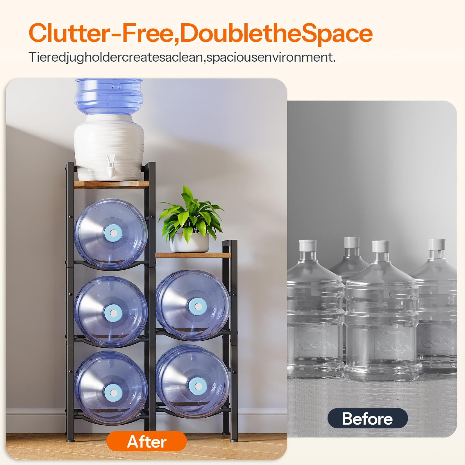 - Thoughtful Design, Practical Use: This 43.3"H 5-gallon water bottle organizer eliminates bending for easy access. Six adjustable feet ensure stability on uneven floors, while anti-tip features provide a safe storage solution for homes and offices