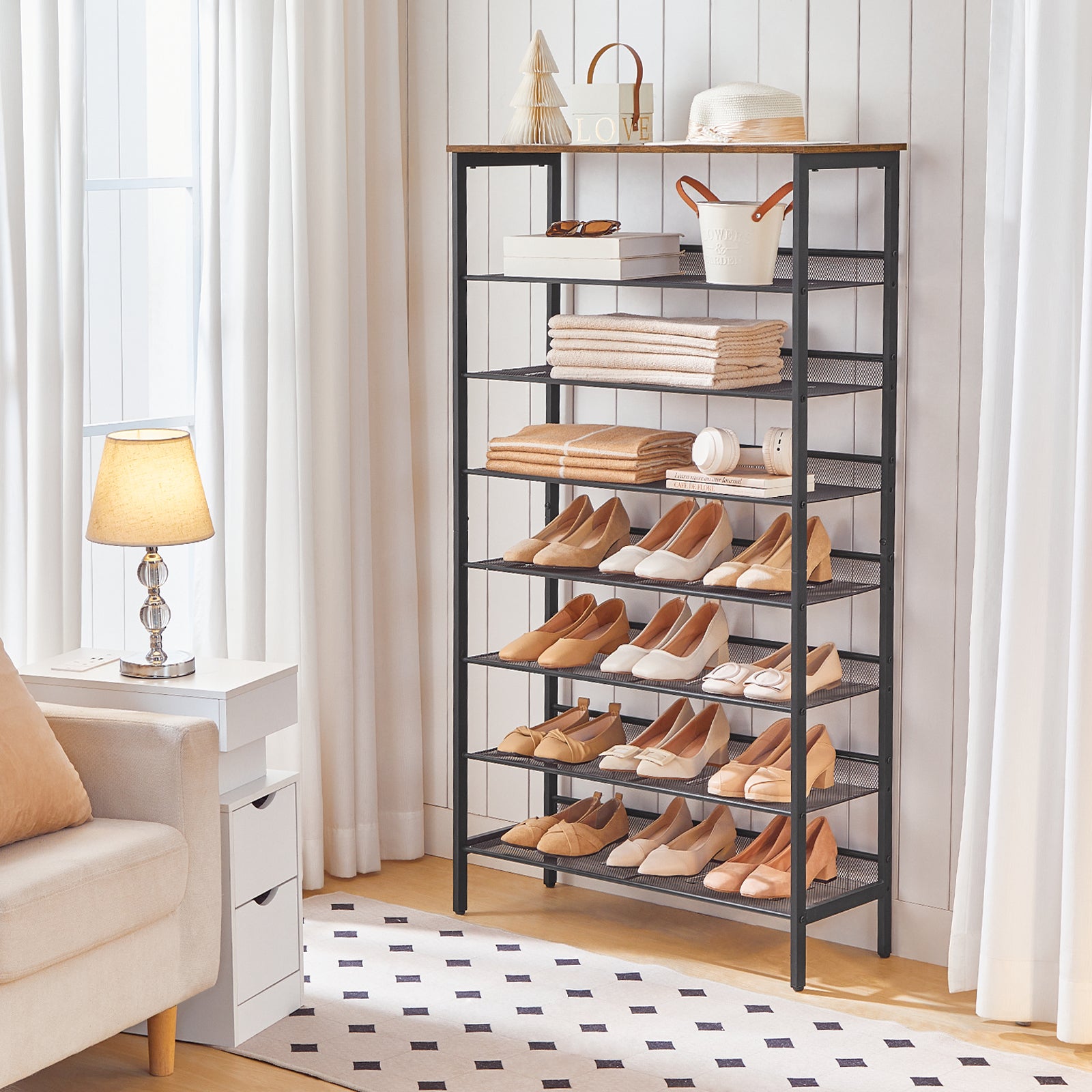 - XXL Shoe Rack: Flats, sneakers and boots are crammed in a closet? No place to put family's shoes all year round? This 8-layer shoe rack completely solves your problem, and is wide enough to holds up to 20+ pairs of shoes. It makes a huge difference and renews the messy hallway