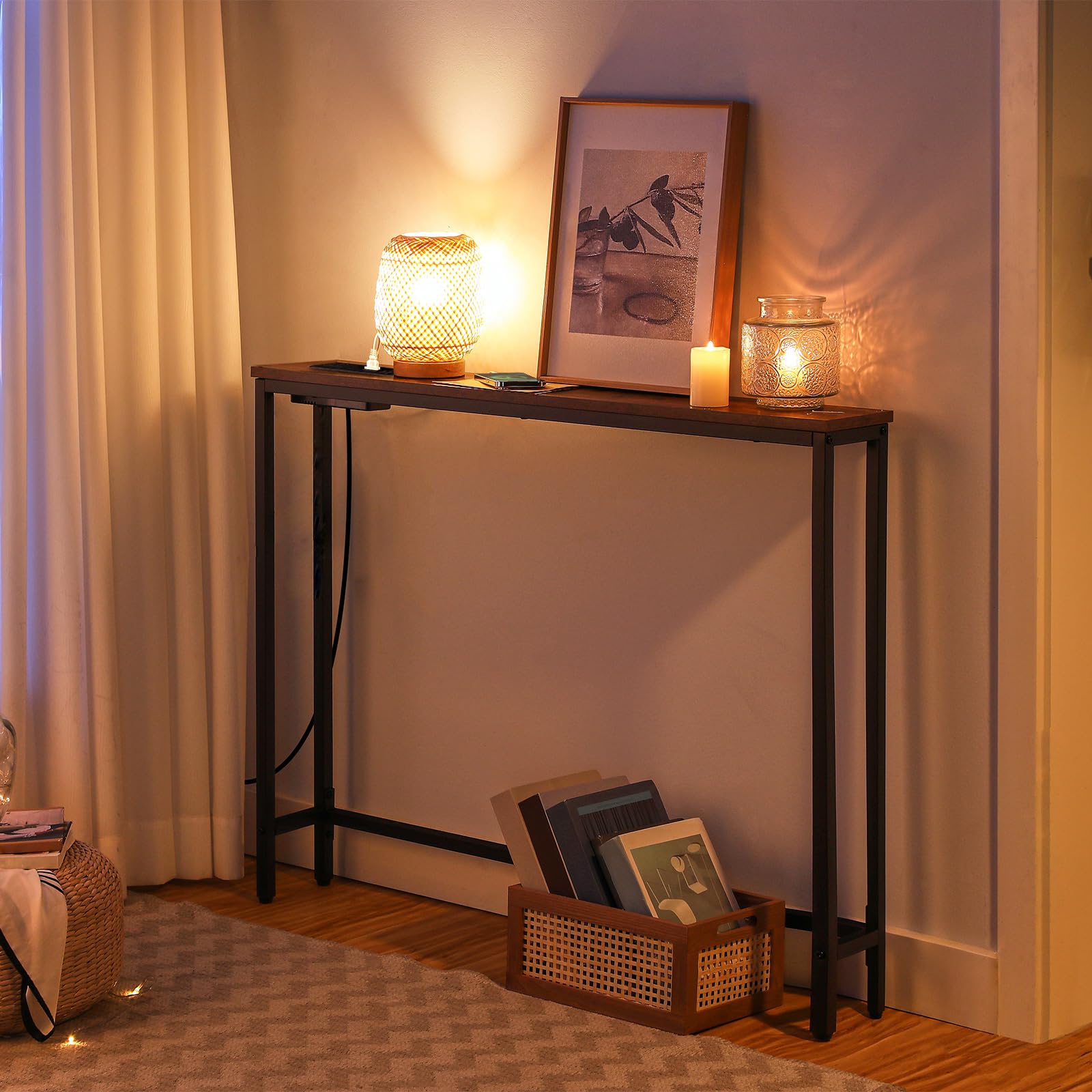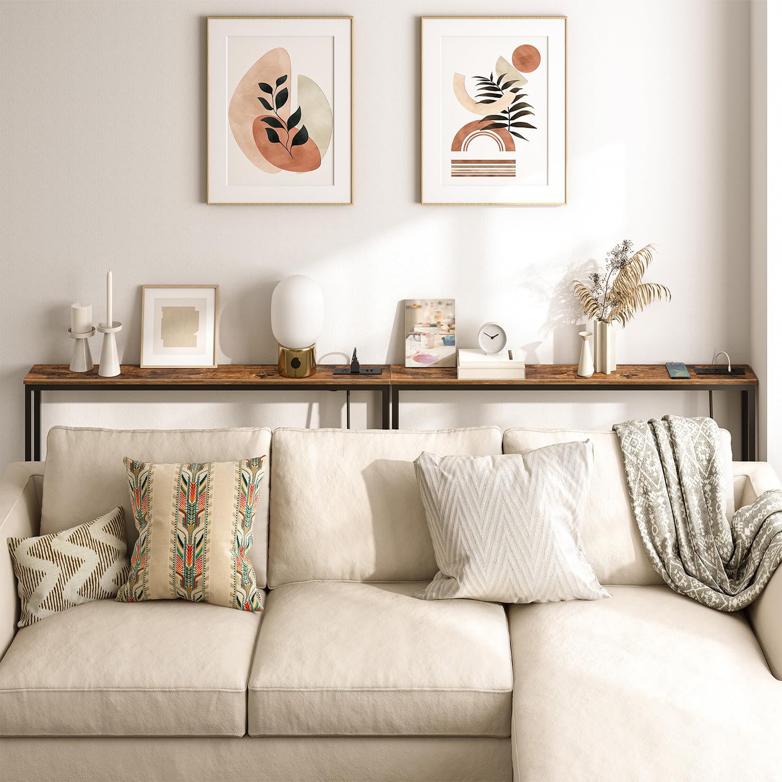 - Behind Couch Table with Outlet: The skinny console table comes with built-in 2 plug outlets, 2 USB ports and a 59" long power cord. With all the functions required for charging, the thin sofa table is ideal for your mobile phone, laptop, desk lamps or tablets