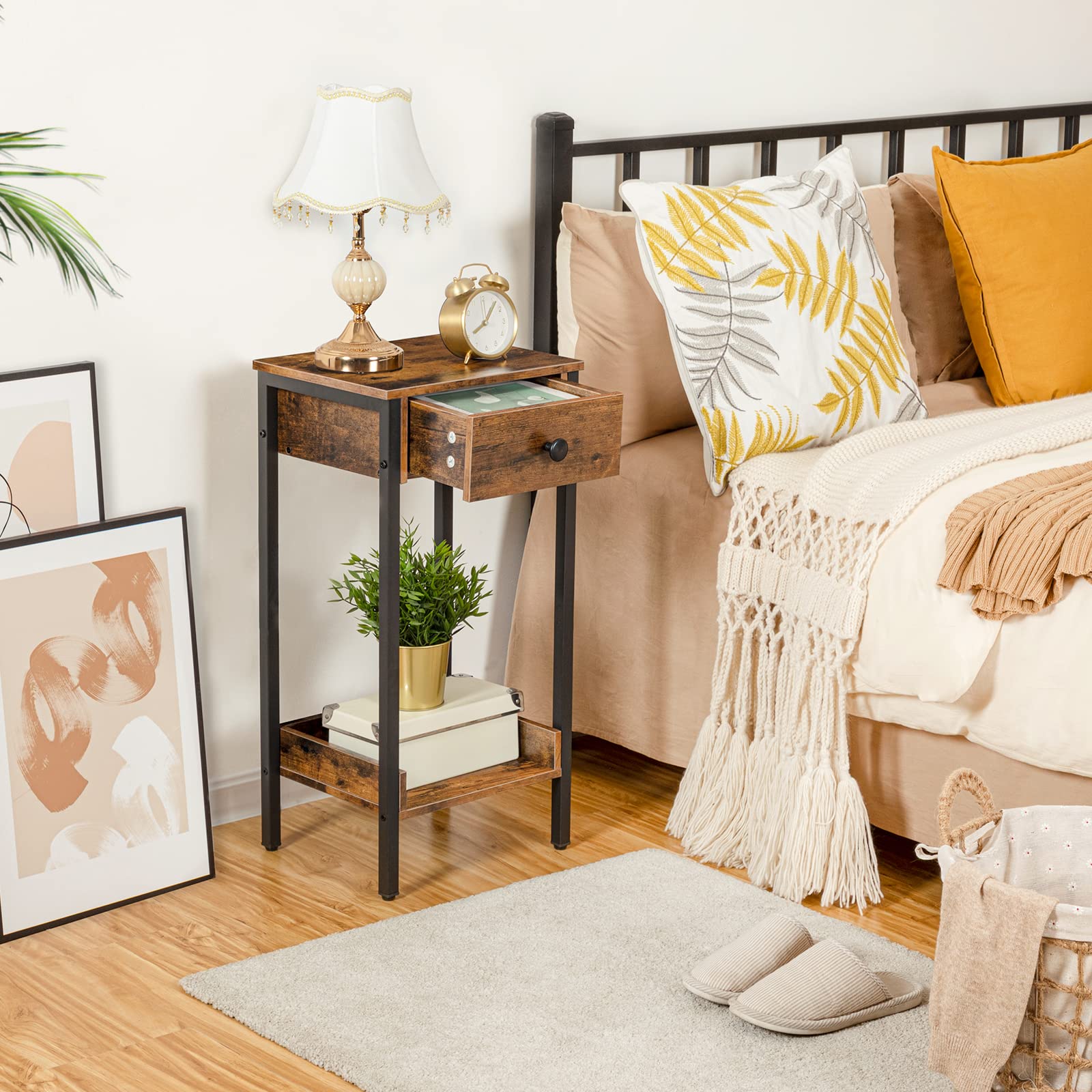 HOOBRO Retro Brown Industrial Style High Side Table with Drawers & Storage Shelves