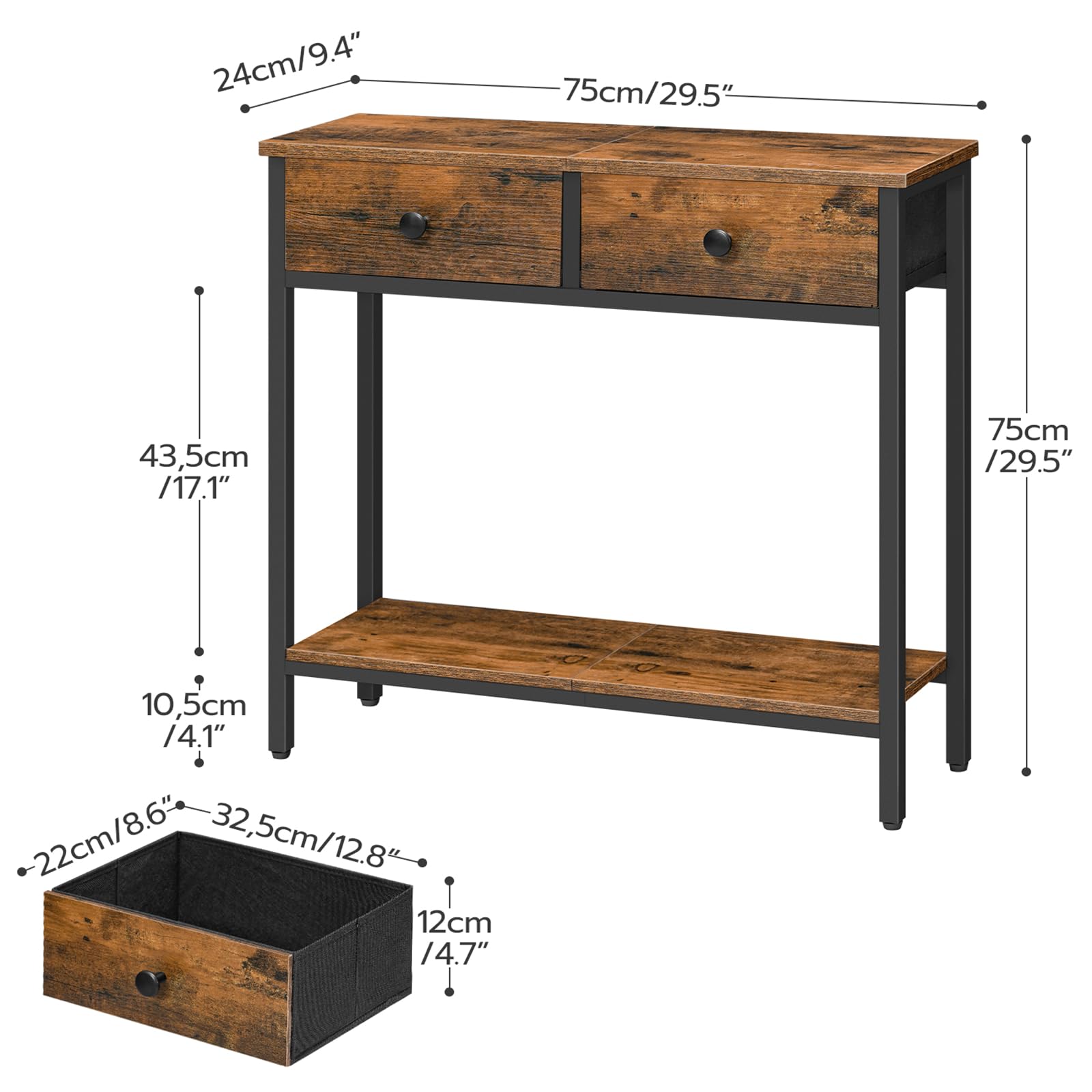 - Multifunctional Console Table: Measuring 29.5"L x 9.4"W x 29.5"H, the narrow entryway table with 2 fabric drawers can be placed in the living room, hallway, bedroom to store books, plants or ornaments. In the kitchen, this narrow table with storage shelf can keep the coffee maker, juicer or grain storage boxes etc