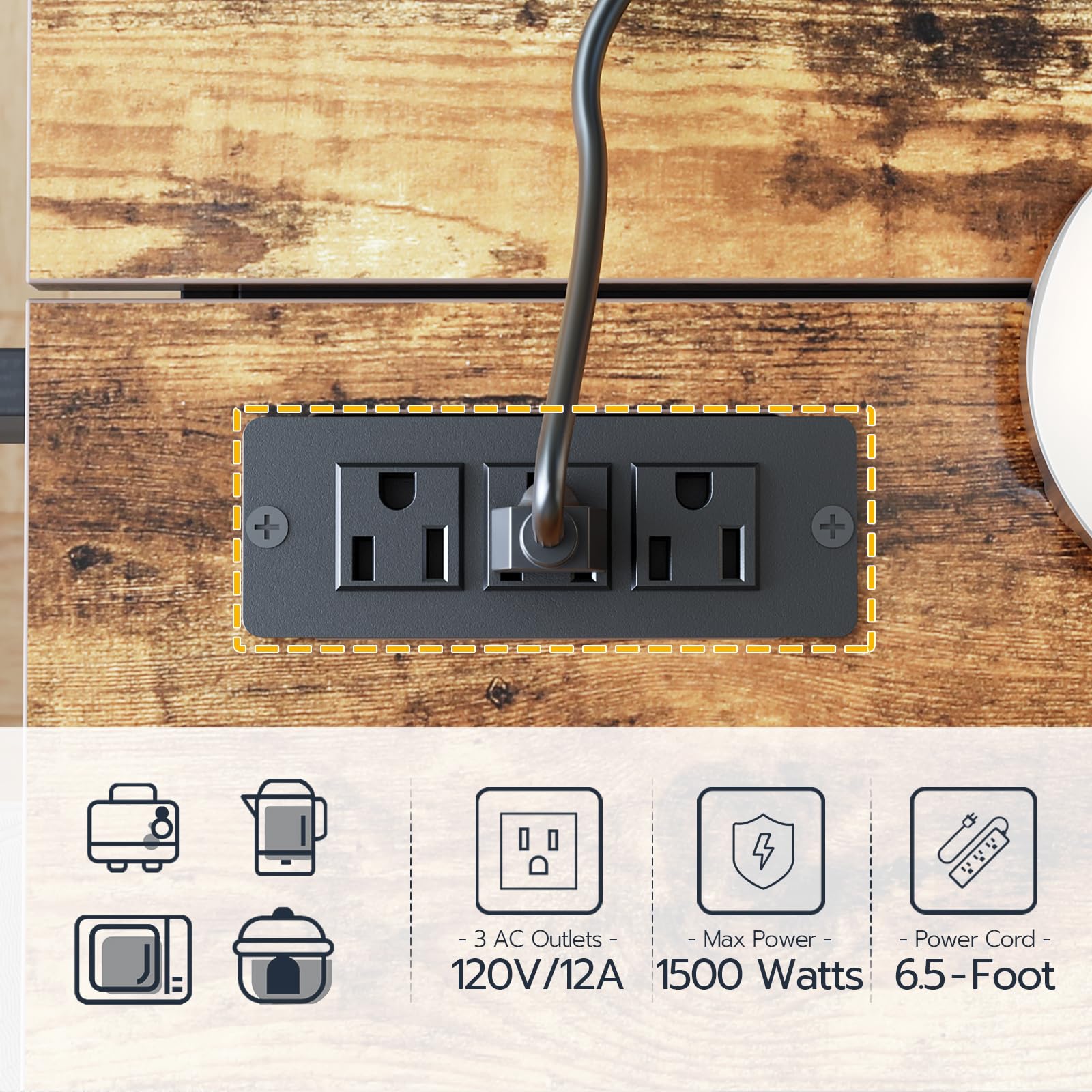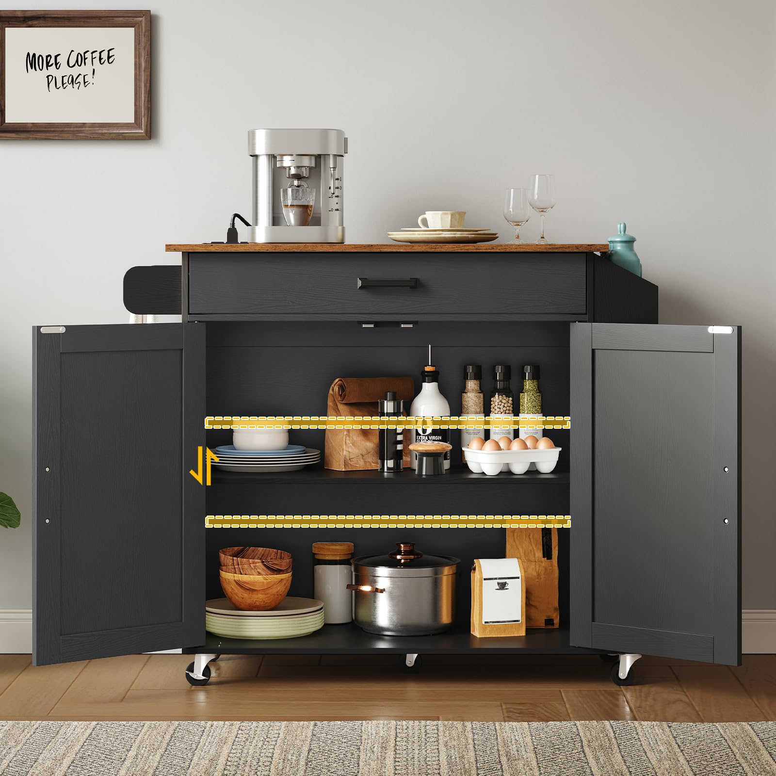 - Ample Storage: Featuring a large drawer and a 2-door cabinet with a 3-height adjustable shelf, this kitchen island with outlet offers abundant storage for dishes, utensils, and more. The right side has a 3-tier spice rack for seasonings and the left side includes a towel rack for easy hanging