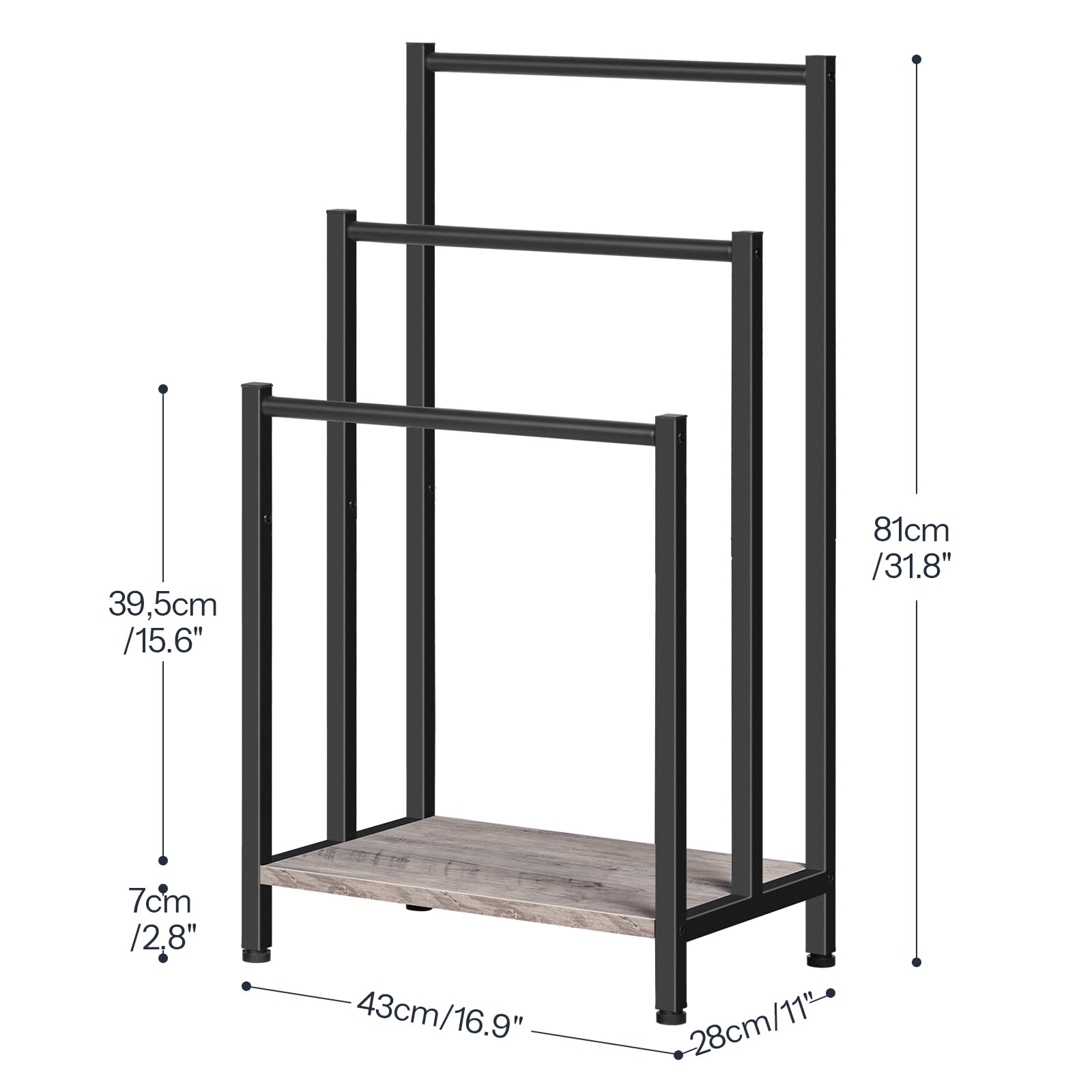 - Multi-Purpose Application: This freestanding towel rack measures 16.9"L x 11"W x 31.9"H, providing additional storage without sacrificing space. Perfect for bathrooms, living rooms, bedrooms, laundry rooms, kitchens, and more. Say goodbye to clutter and easily access your daily necessities