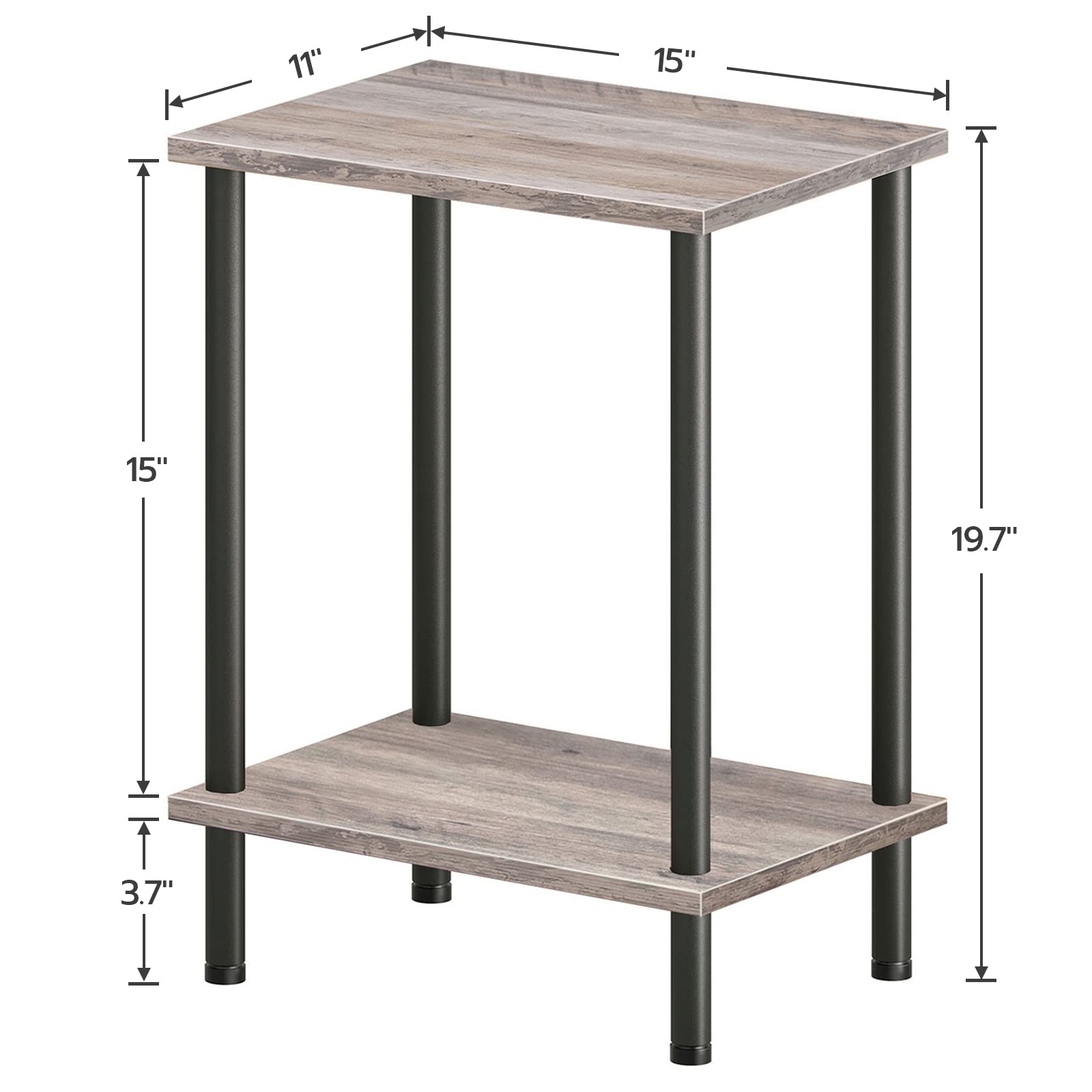 - How about the Quality? Reliable! Sizes: 15"L x 11"W x 19.7"H. The sturdy particleboard panel is tightly connected to the strong metal legs, so this bedside table can stand beside you year after year