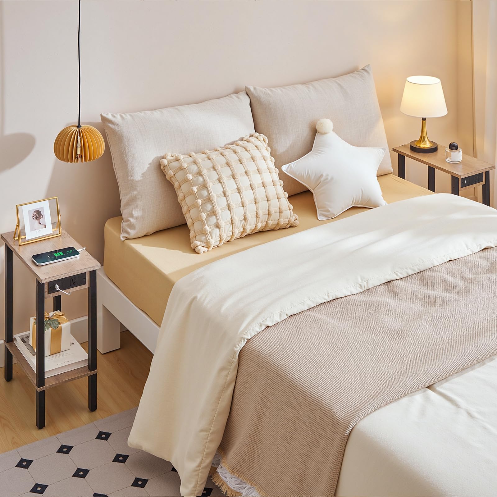 HOOBRO Greige Double-Layer Narrow Side Table with Charging Station & Open Storage