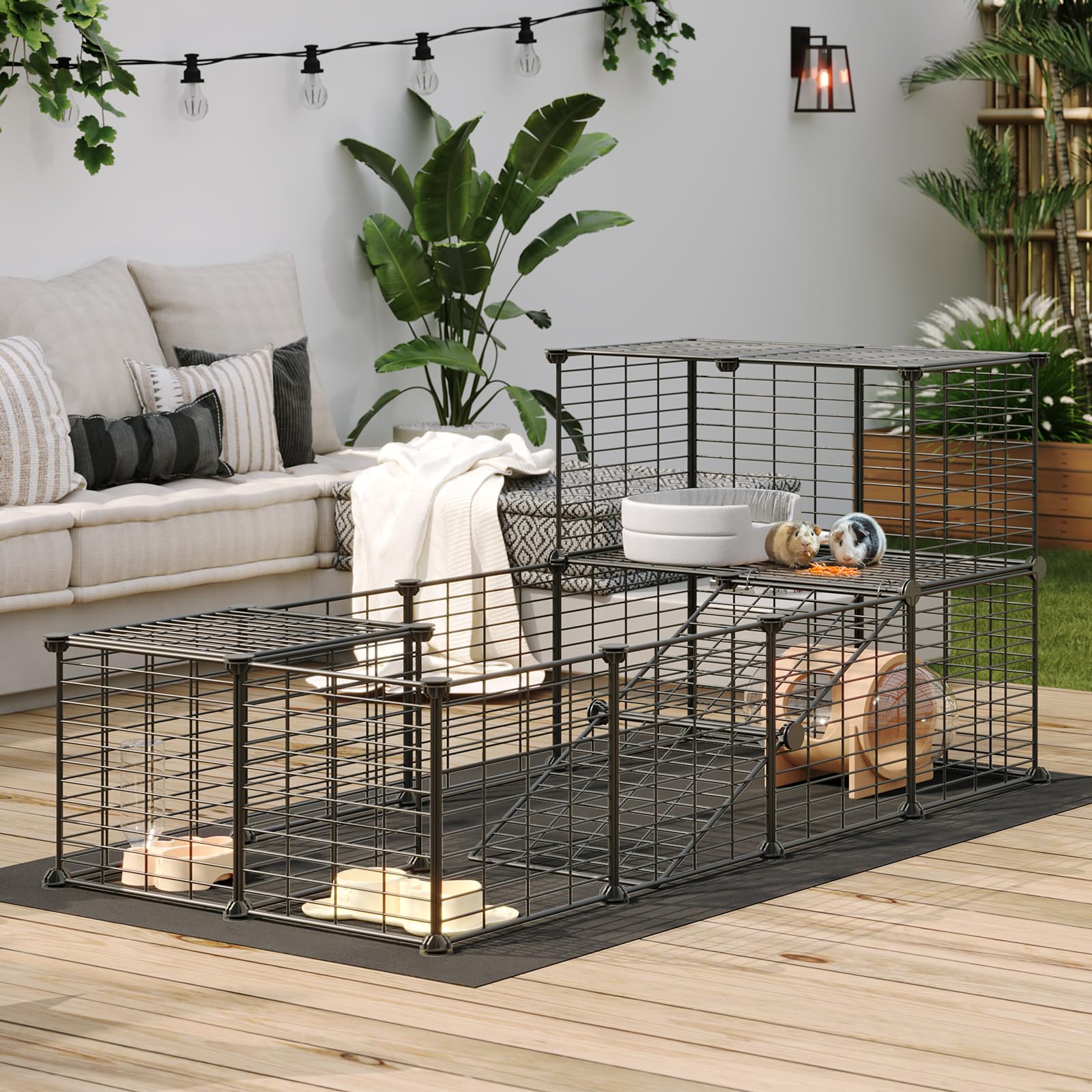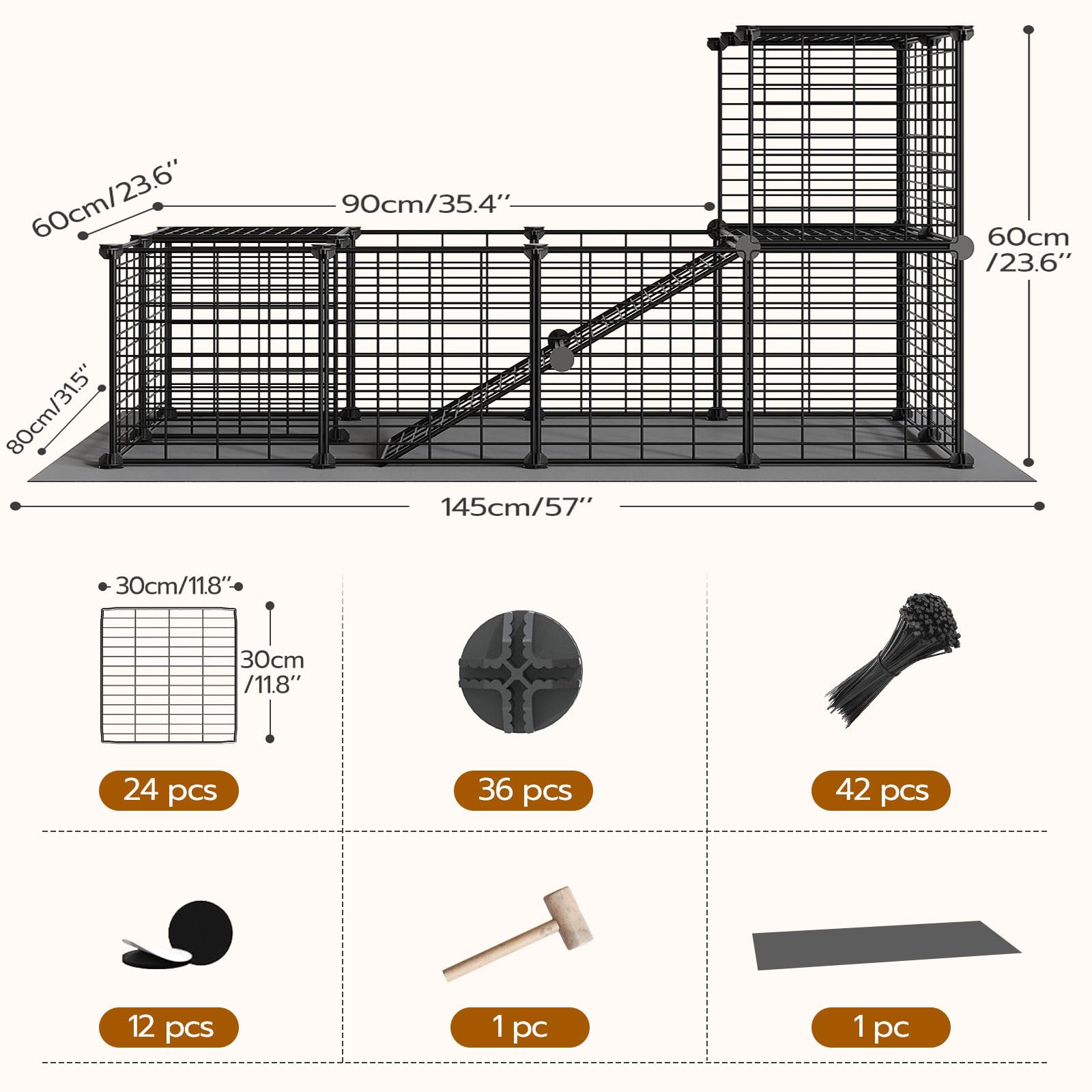 - Guinea Pig Cage Dimension: The dimensions of the guinea pig cage are 57 x 23.6 x 31.5 inches, composed of 24 (11.8"L x 11.8"W) mesh panels, offers ample space for various zones such as feeding, resting, exploring, and toileting areas
