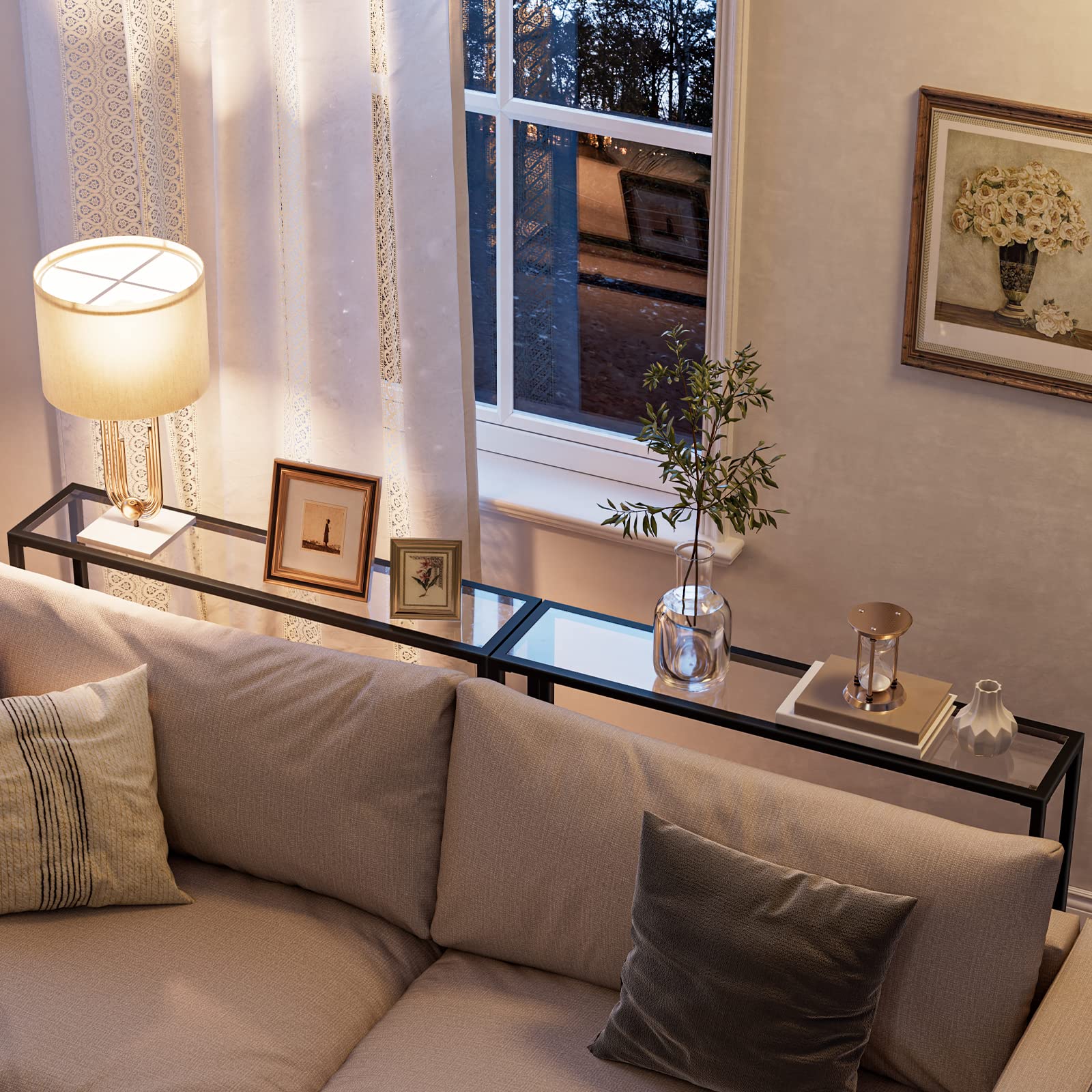 - Simplified Assembly: This entryway table has a simple construction.With transparent glass top and a streamlined metal frame, even if you are a novice, you can understand the assembly process at a glance