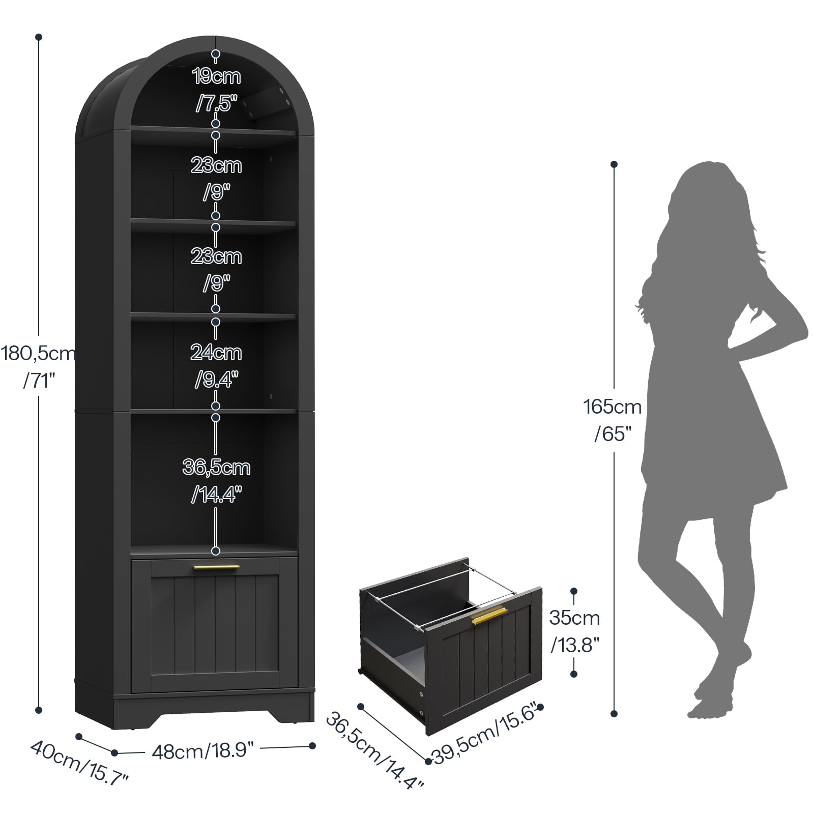 - Multifunctional Storage: This arched bookshelf with Drawer combines bookshelf and file cabinet functions. The 5 open shelves can hold books and decorations, while the bottom drawer stores letter-sized/A4 files, helping you organize diverse items efficiently for a neater space