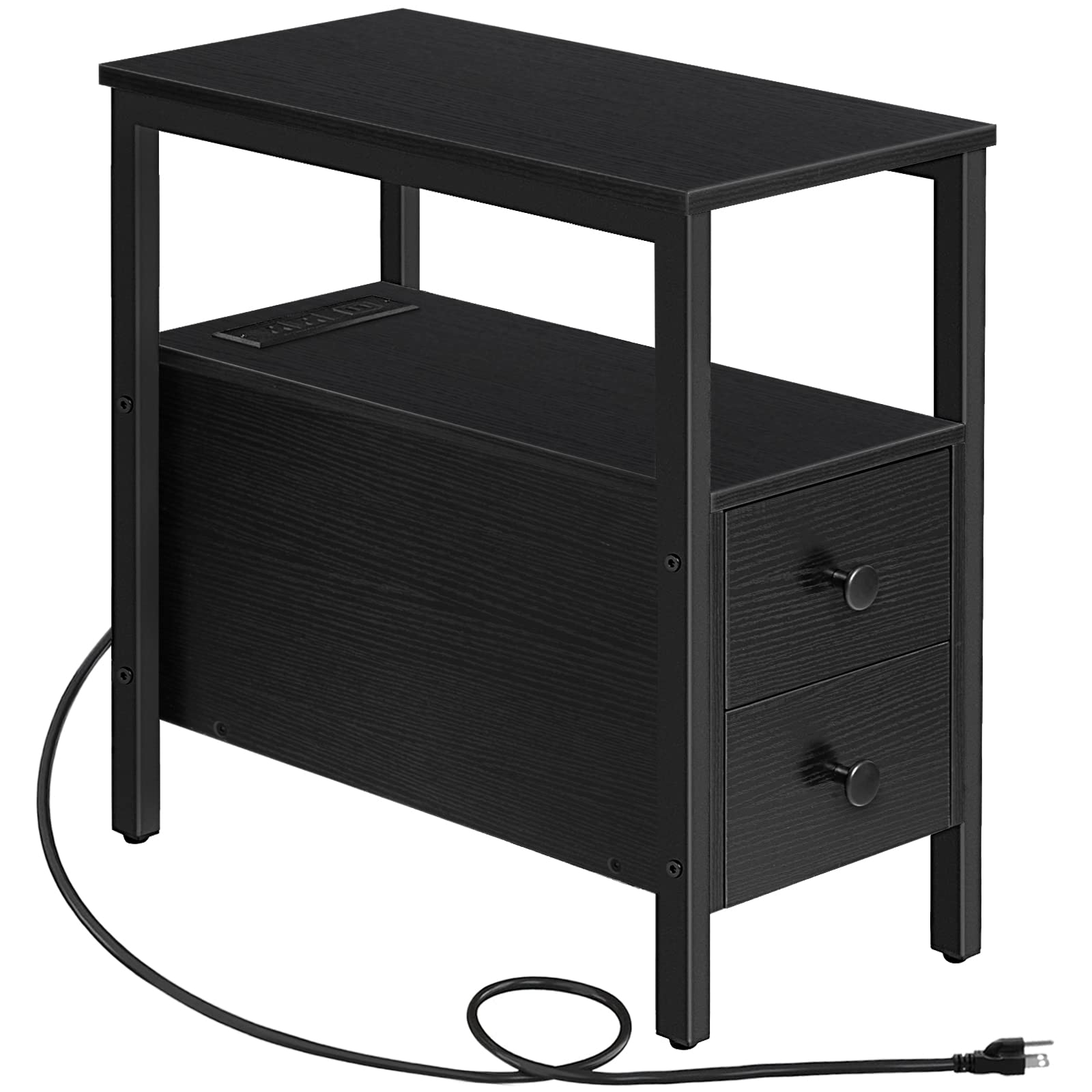 HOOBRO Black Narrow Side Table with 2 Drawers & USB Port & Power Outlet