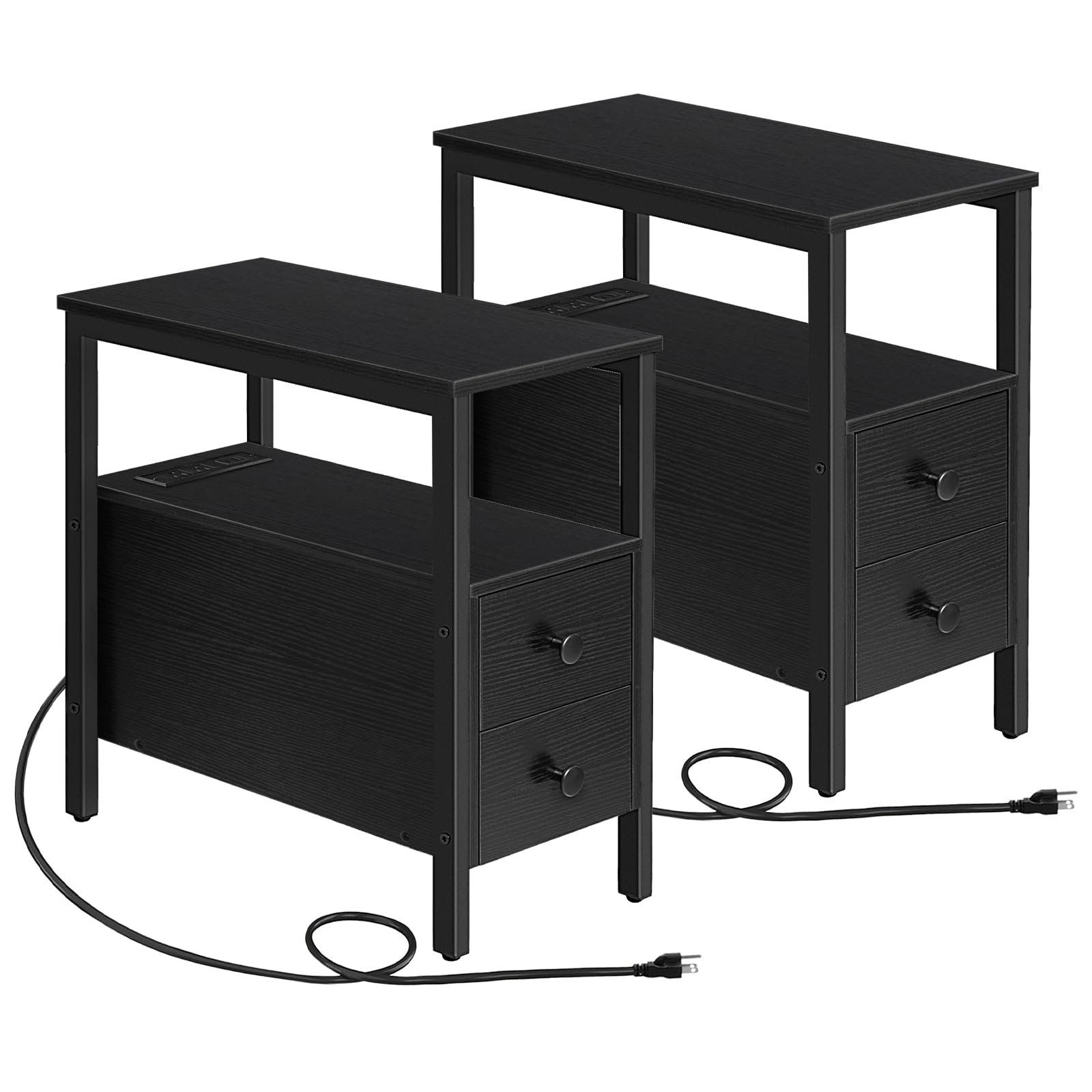 HOOBRO Black Side Table with Charging Station, Drawer, USB Port, and Power Outlet / 2PICS