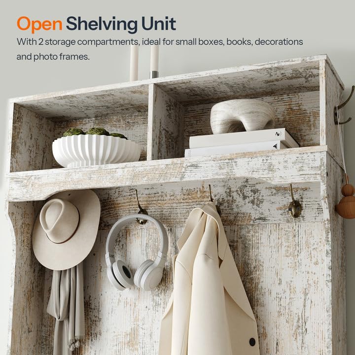 - Versatile Storage: This hall tree with bench and shoe storage has multiple functions with 2 top compartments for decorative items, 6 hooks for bags, coats, etc. and a spacious 4-partitioned cabinet that can be a shoe bench for footwear, instantly making your entrance organized