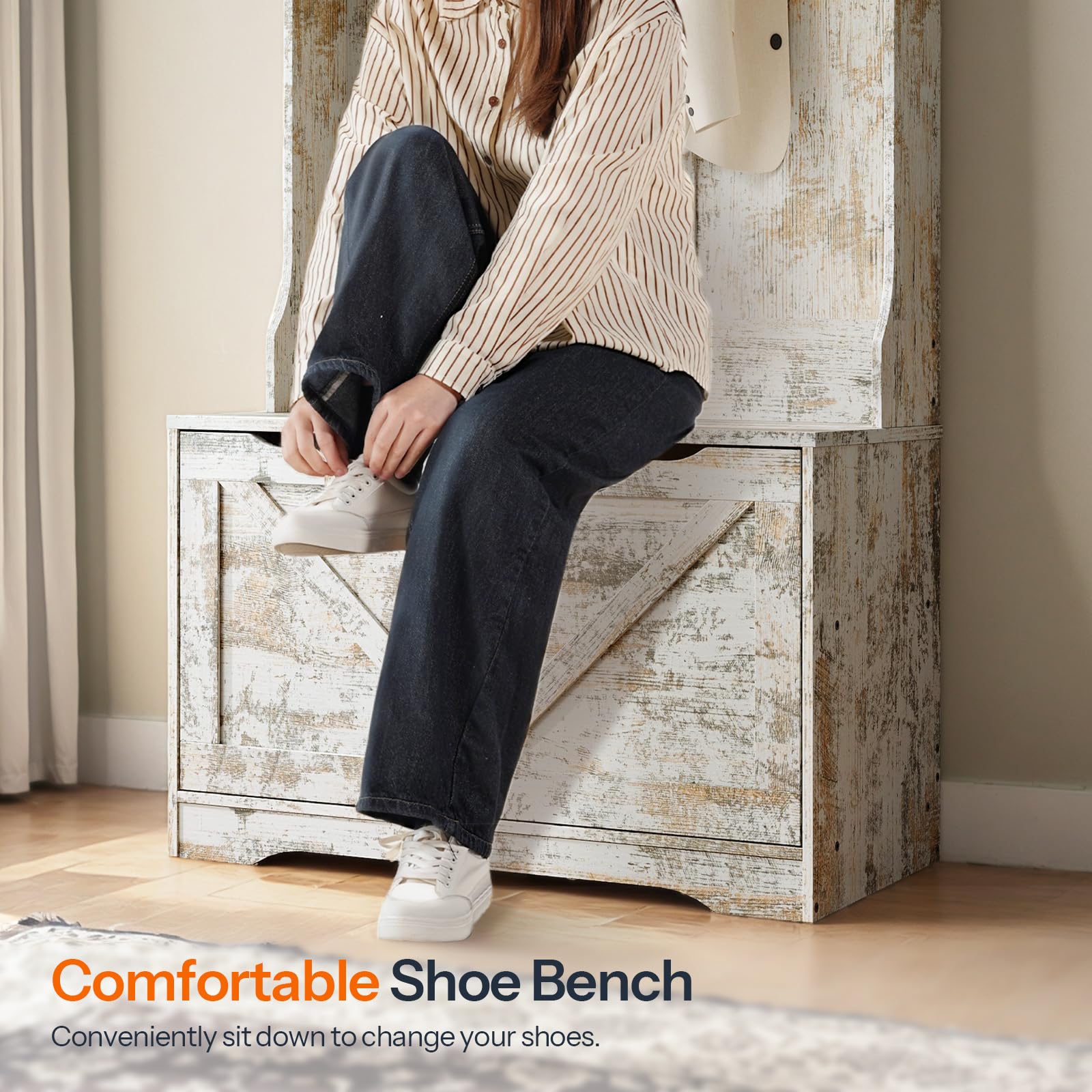 HOOBRO Vintage White Bench with Flip-Top Shoe Cabinet & Coat Rack for Entryways