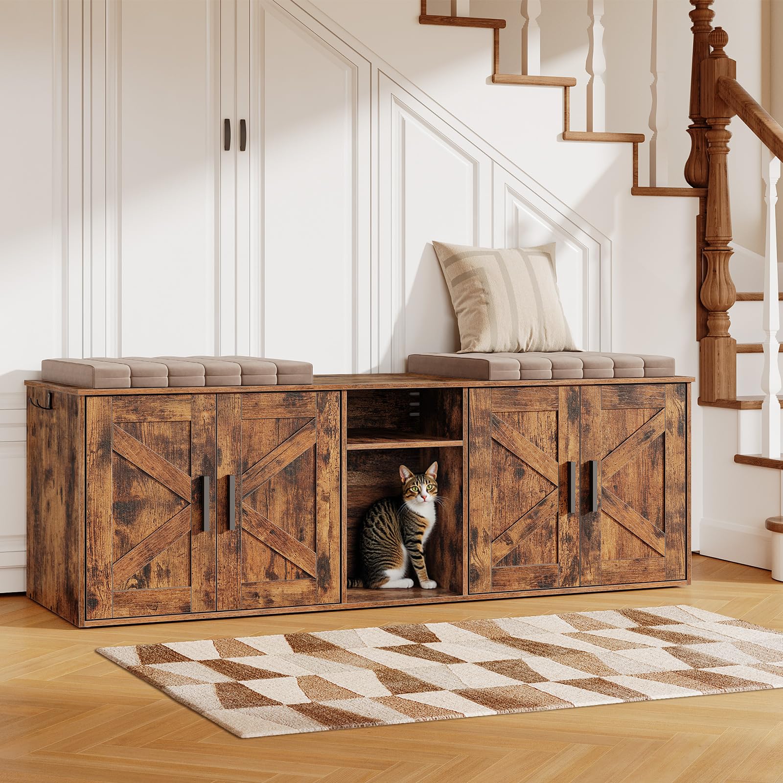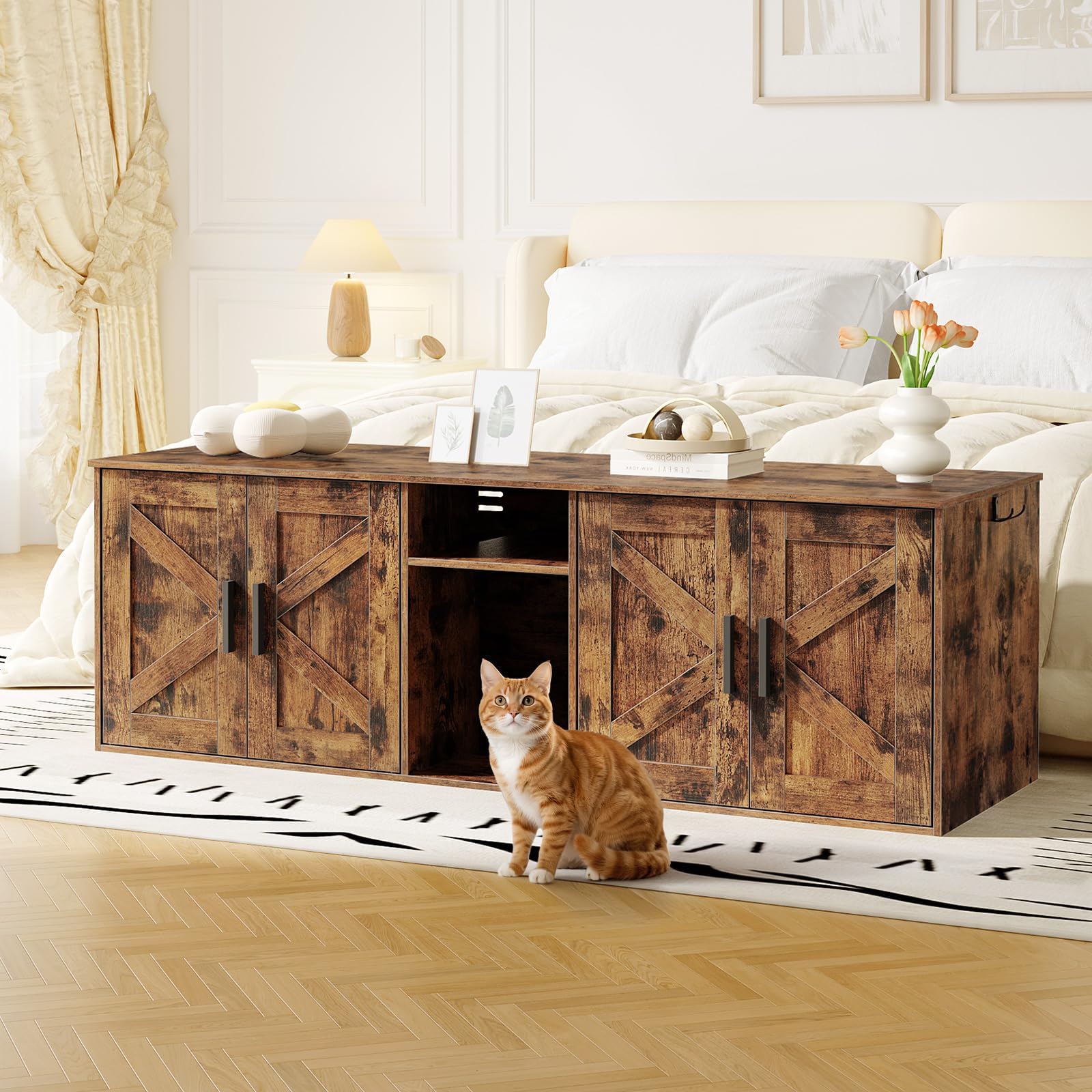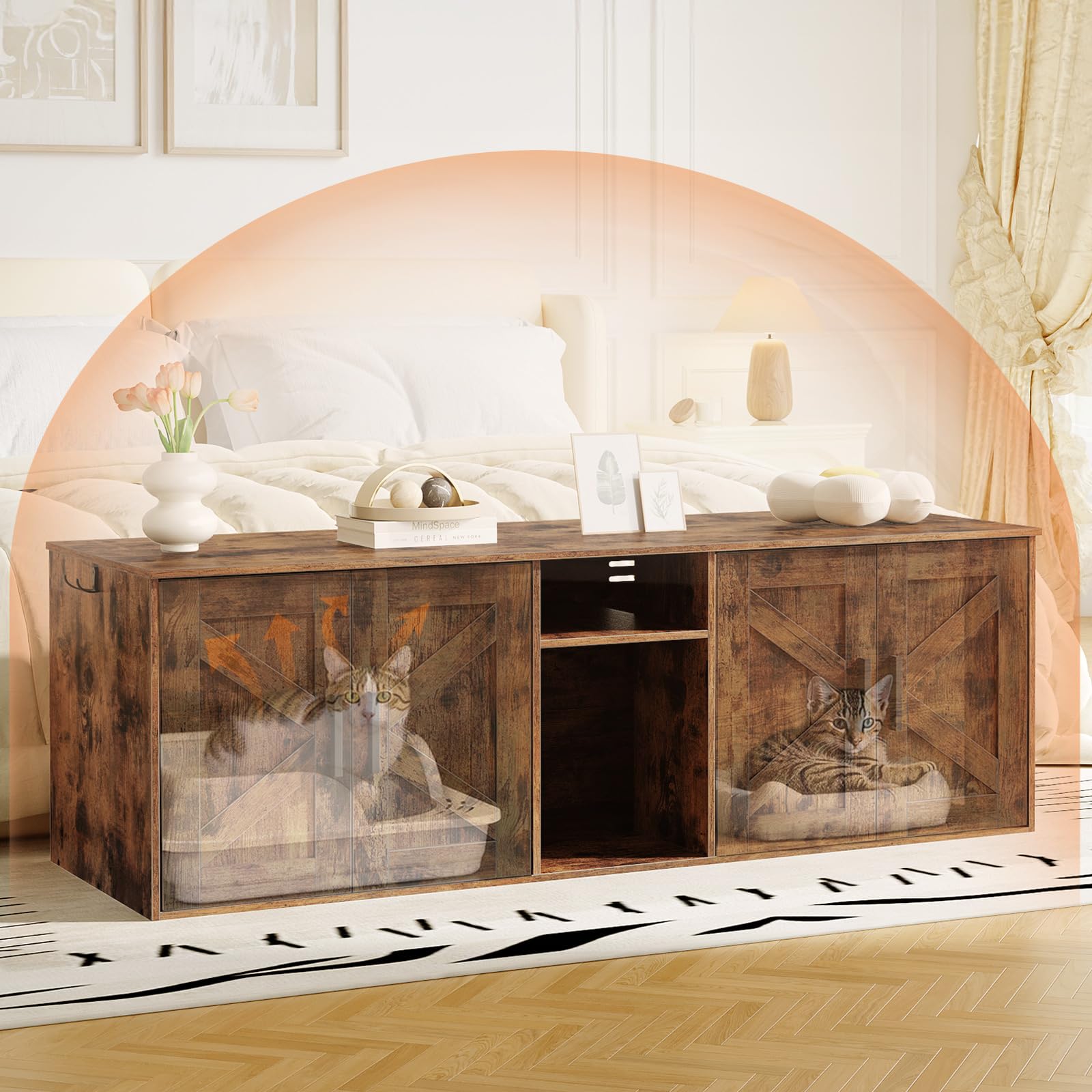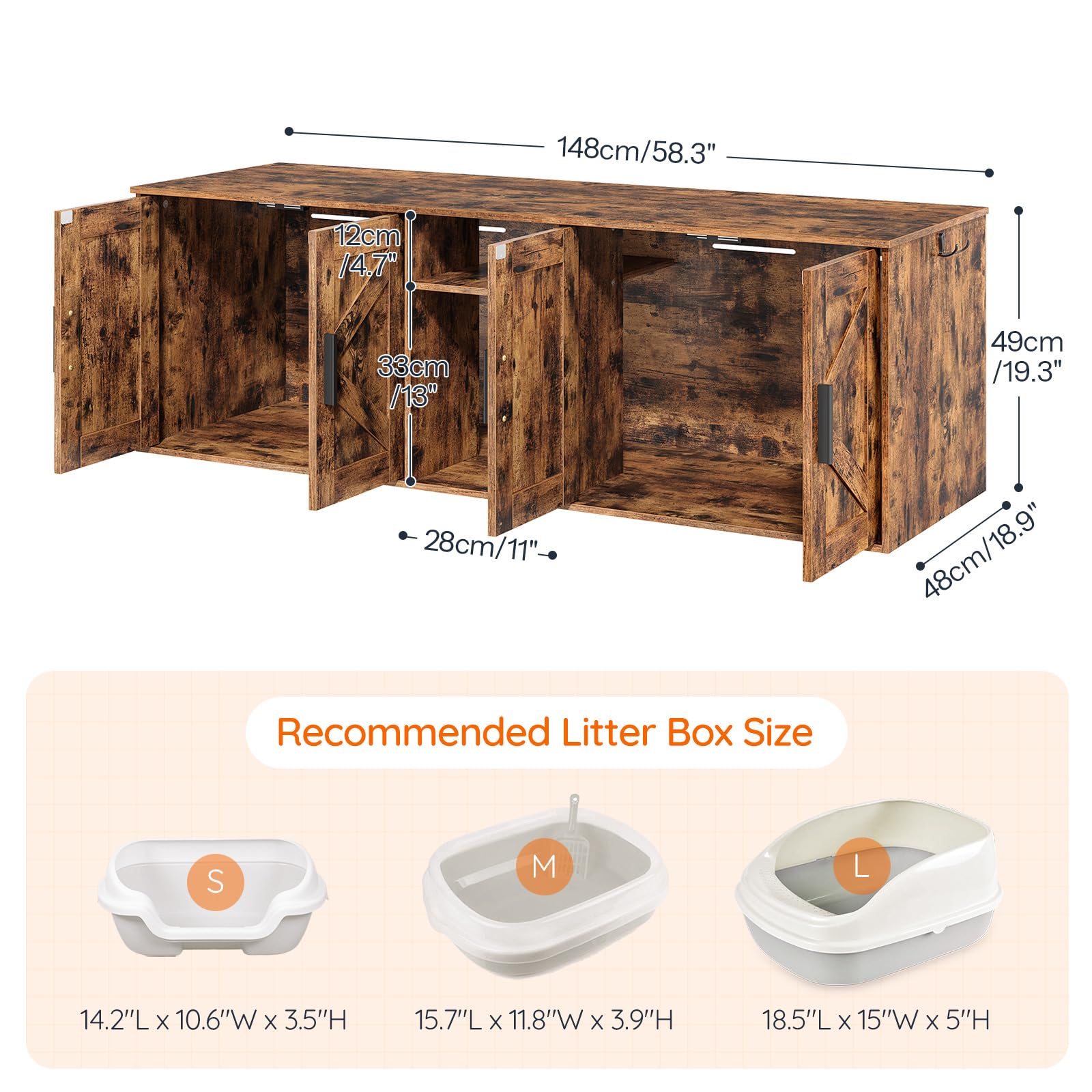 - Dual Litter Box House Design: This cat litter box enclosure, with a size of 58.3"L x 18.9"W x 19.3"H, comfortably accommodates two litter boxes (up to 58.3"L x 18.9"W) or two cat beds, or one litter box and one bed, ensuring each feline enjoys private space