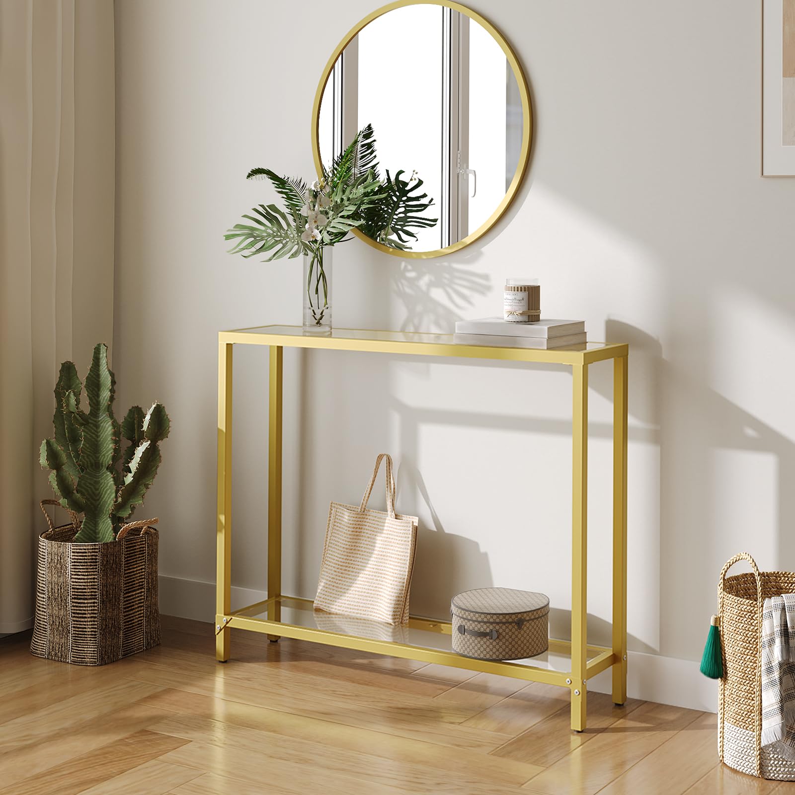 - Stunning Minimalism: Take your home to the next level with a modern console table that unites sleek, golden-colored metal and a tempered glass tabletop into one minimalist-yet-functional piece, using as entryway table, hallway table, foyer table, behind couch table and so on