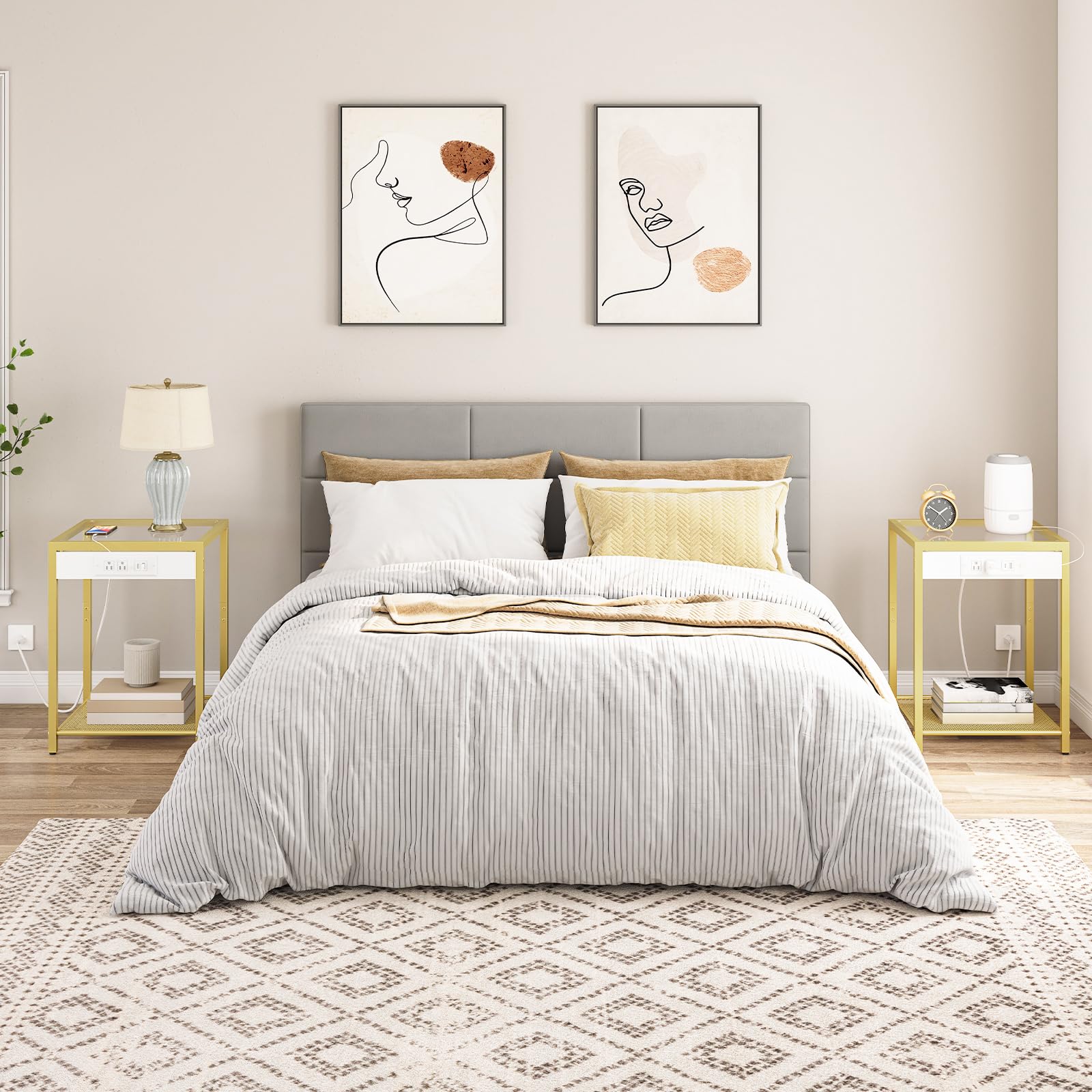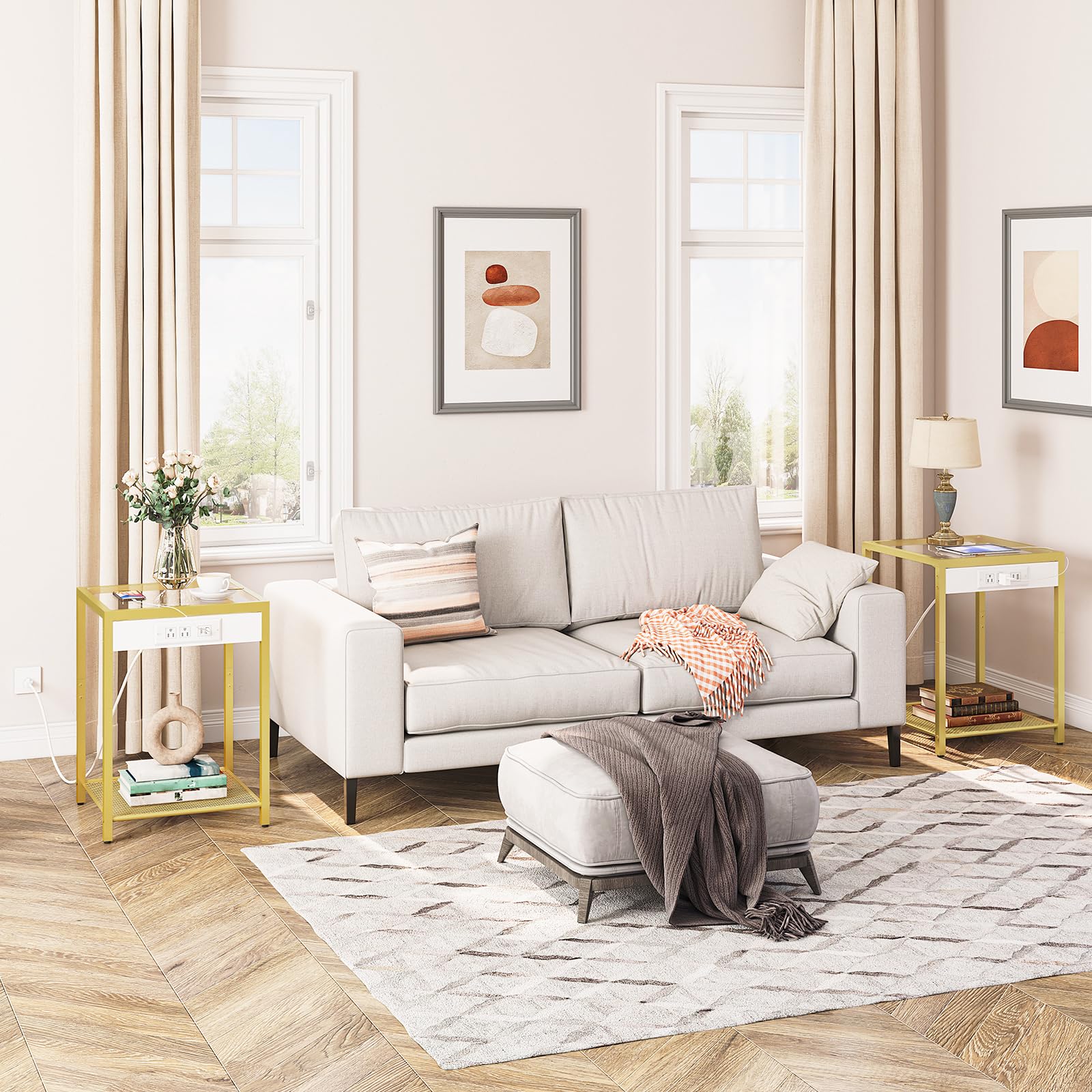 HOOBRO Gold Modern Metal Frame Tempered Glass Desktop Side Table with USB Port & Charging Station / 2PICS