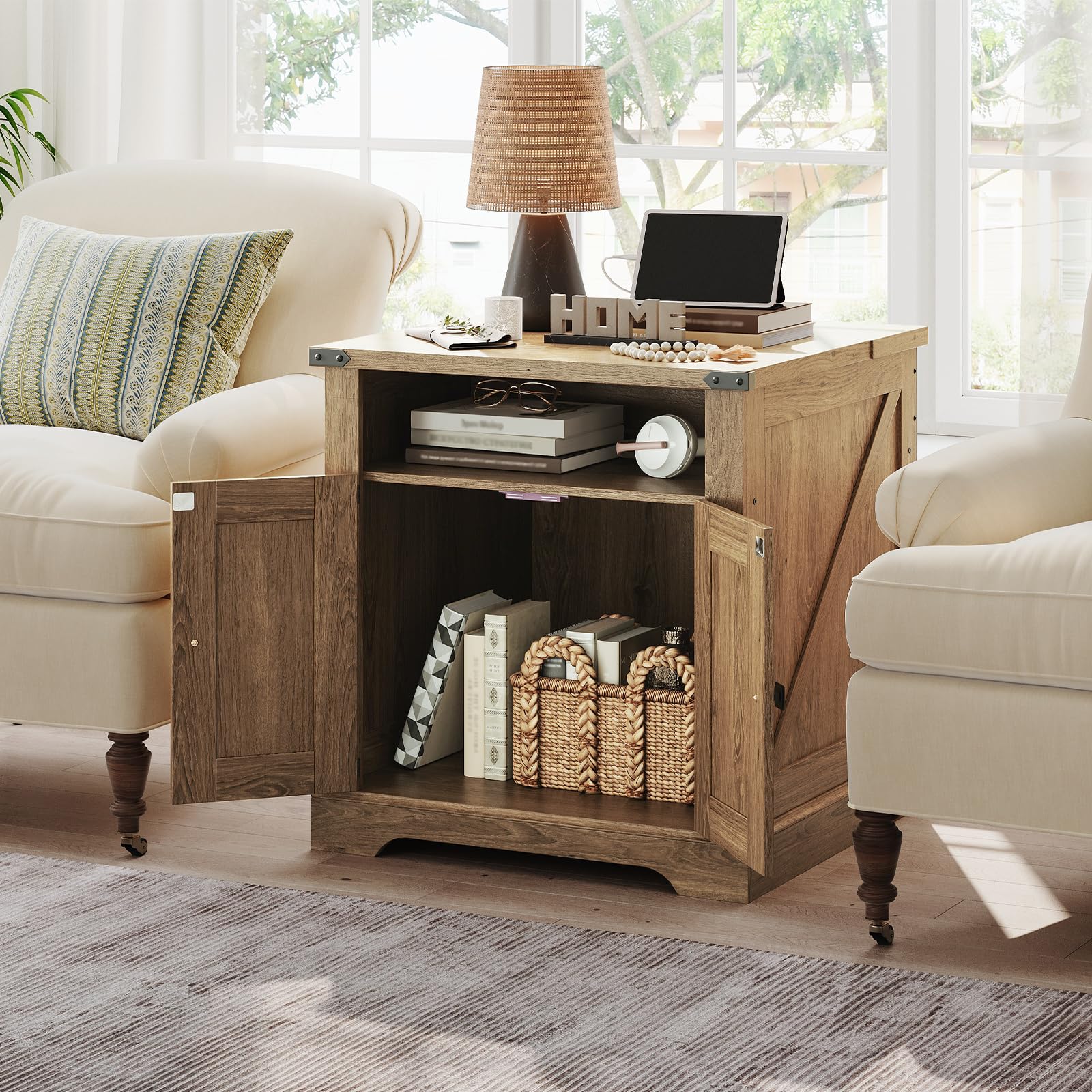 - Spacious Storage Space - Practical and Organized: With dimensions of 23.6"L x 23.6"W x 25.6"H, this boho end table offers generous storage space to meet all your daily needs. Featuring a spacious tabletop, a semi-open compartment, and a double-door cabinet, it provides ample room to store books, remote controls, or decor items, keeping your living room neat and organized.