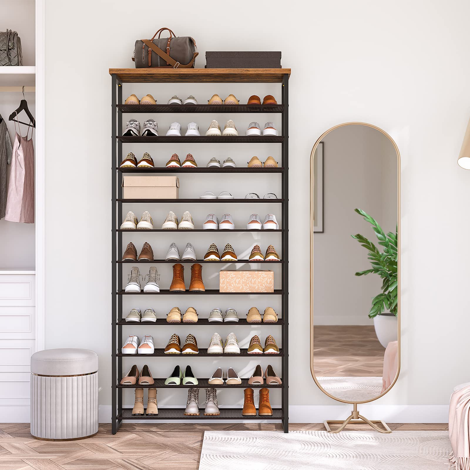 - Large-Capacity Shoe Rack: Measuring 29.5"L x 11.2"W x 75.2"H, this 12-tier shoe rack maximizes vertical storage while saving floor space. It can neatly hold up to 48 pairs of shoes, helping transform a cluttered entryway into a clean and organized area.