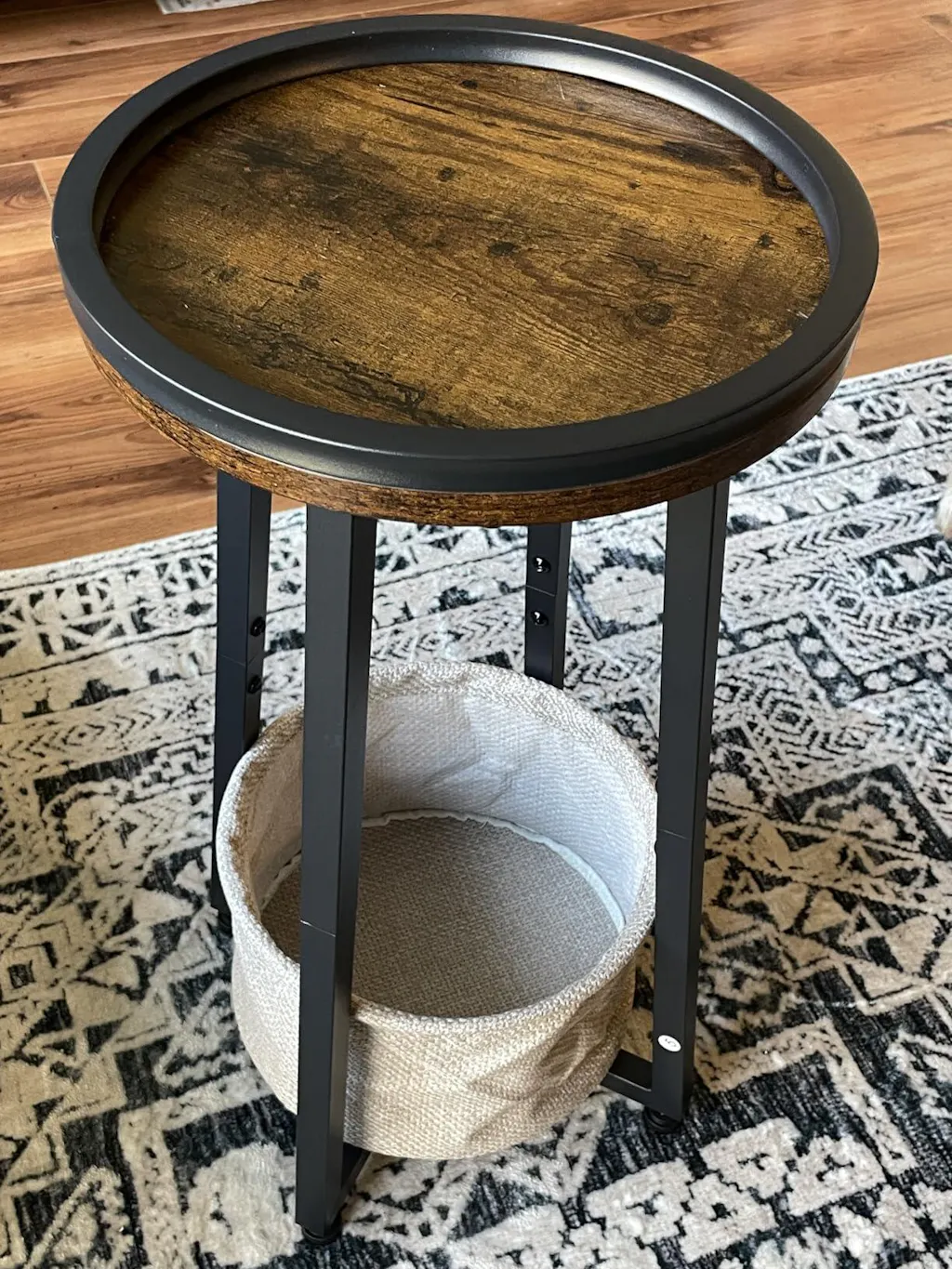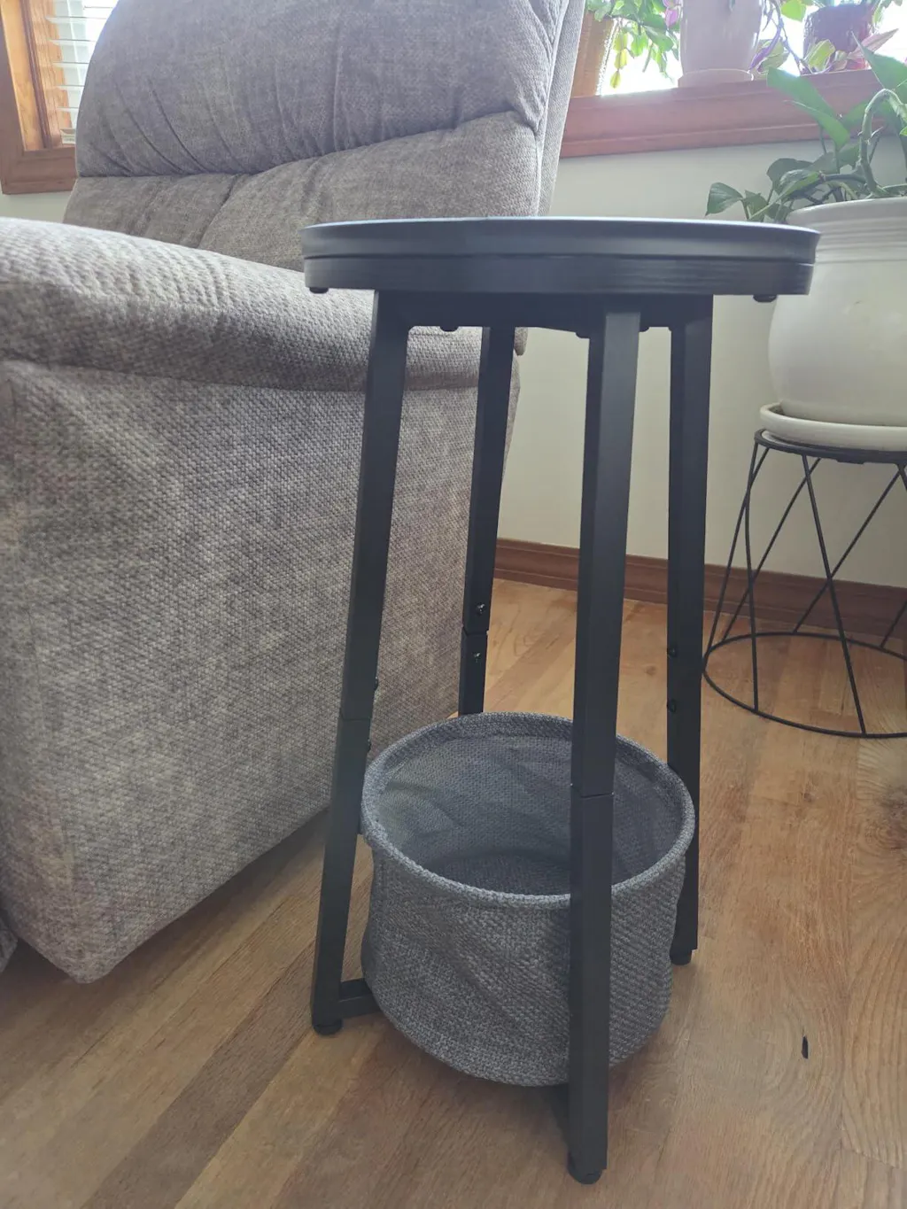 - Two-Tier Functional Design: This round side table features a smart two-level structure that combines display and storage. The tabletop is designed with a protective raised edge to keep cups, plants, or small decor safely in place, while the wrinkle-resistant cotton-linen basket underneath neatly stores books, remotes, and everyday essentials for easy access.