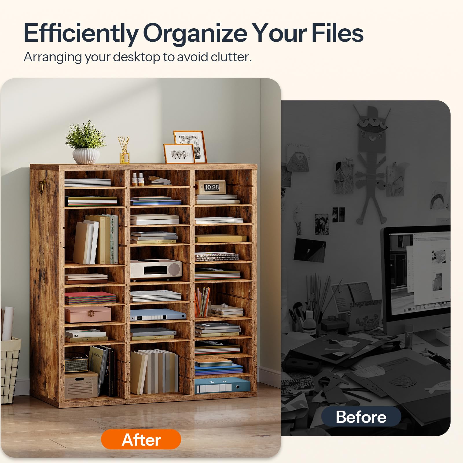 - Personalized Configuration: The file sorter adopts removable design for its internal horizontal shelves to store large-sized documents or office supplies. A slight pull adjusts the compartment size to hold all and frees you from clutter in your room