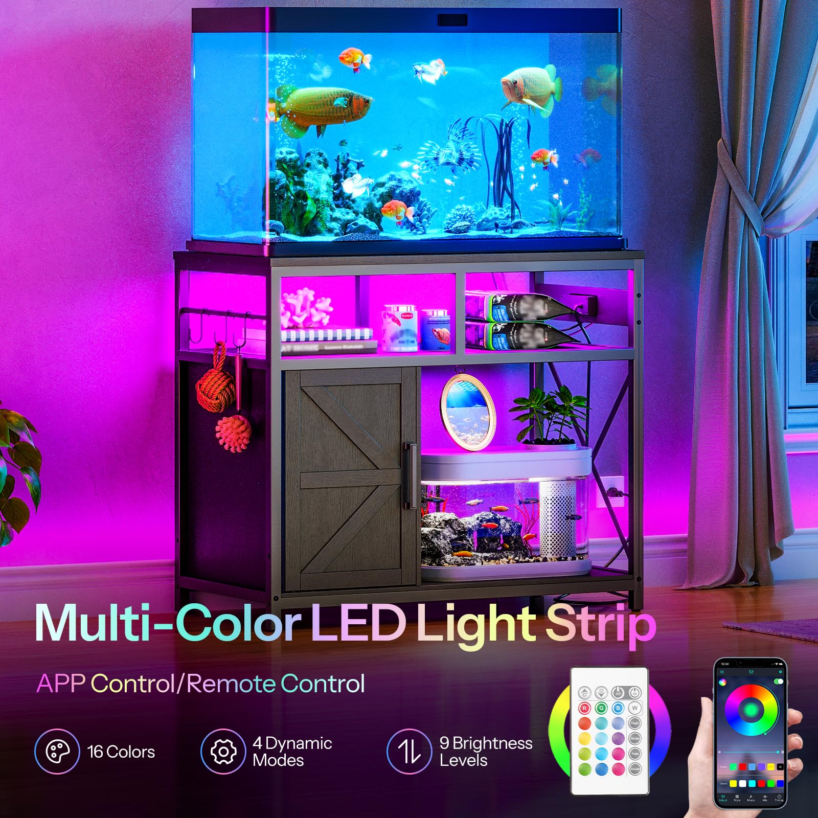 - With Power Out and LED Lights: This fish tank stand features a power strip with 2 AC outlets, 1 USB port, and 1 Type-C port to power aquarium devices like filters and oxygen pumps. The multi-color LED light strip creates a captivating ambiance for the fish, turtles and reptiles in the tank