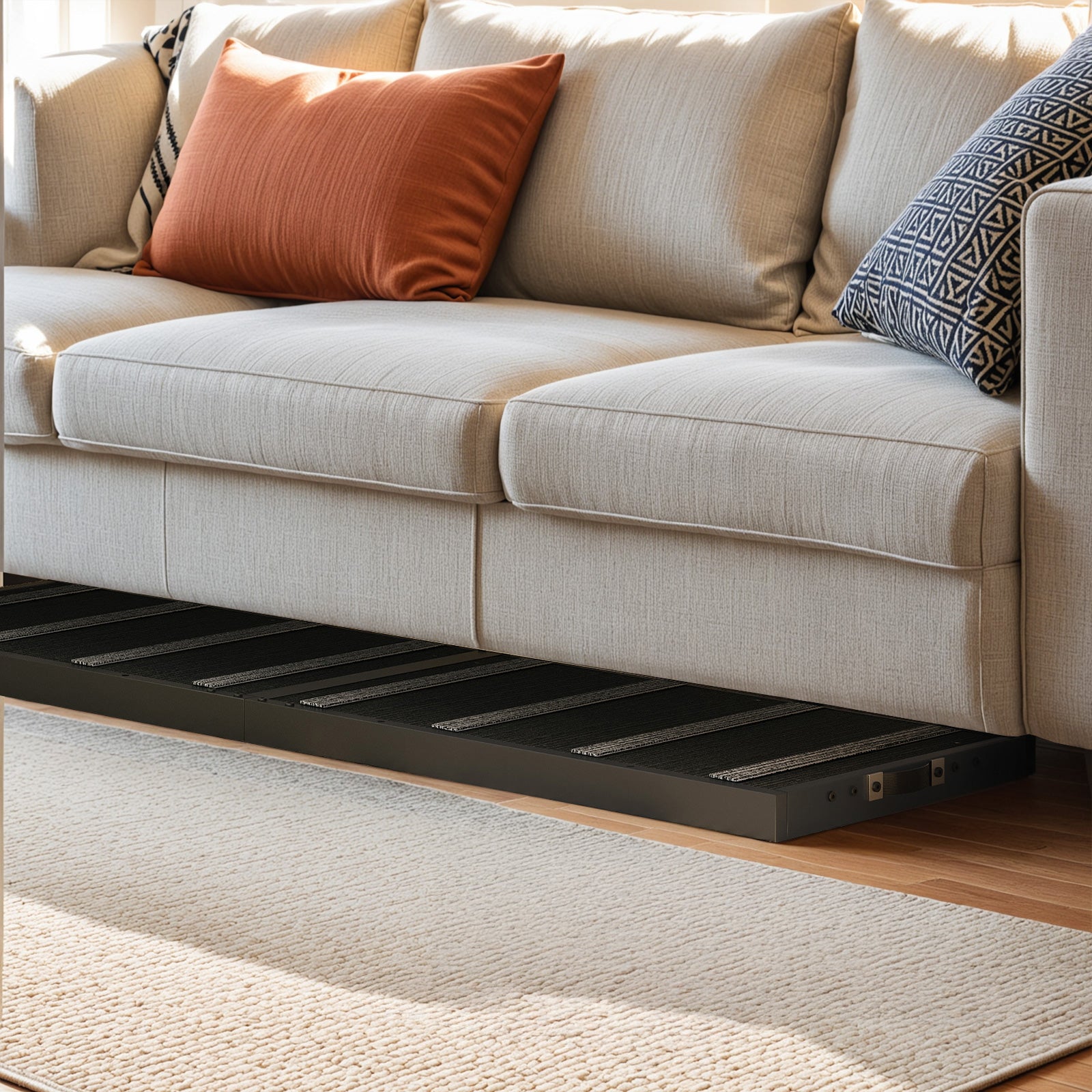- Space Saving, Flexible Storage: Note: Please retract the ramp before moving it. Once in place, adjust the height as needed. When not in use, the rail can be removed and secured with the top rope. It can be leaned against a wall or laid flat under sofas, beds, or other furniture, with a thickness of only 3.15 inches.