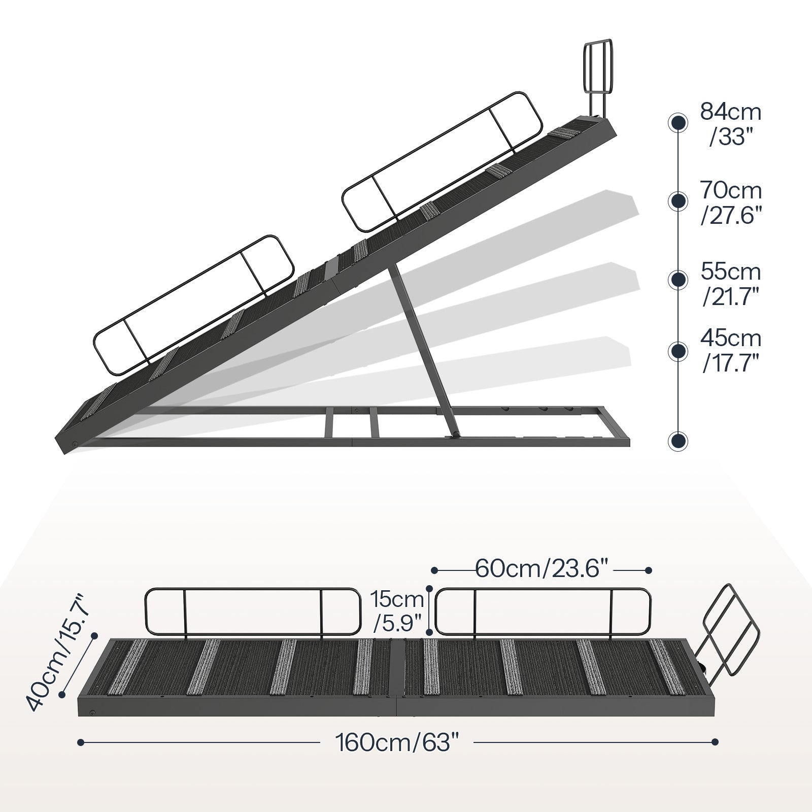 - 4 Height Adjustable: This 63-inch long dog ramp offers 4 adjustable heights: 17.7 inches, 21.7 inches, 27.6 inches, and 33 inches, fitting beds or sofas. Perfect for small or senior dogs, reducing the stress of jumping up and down furniture.