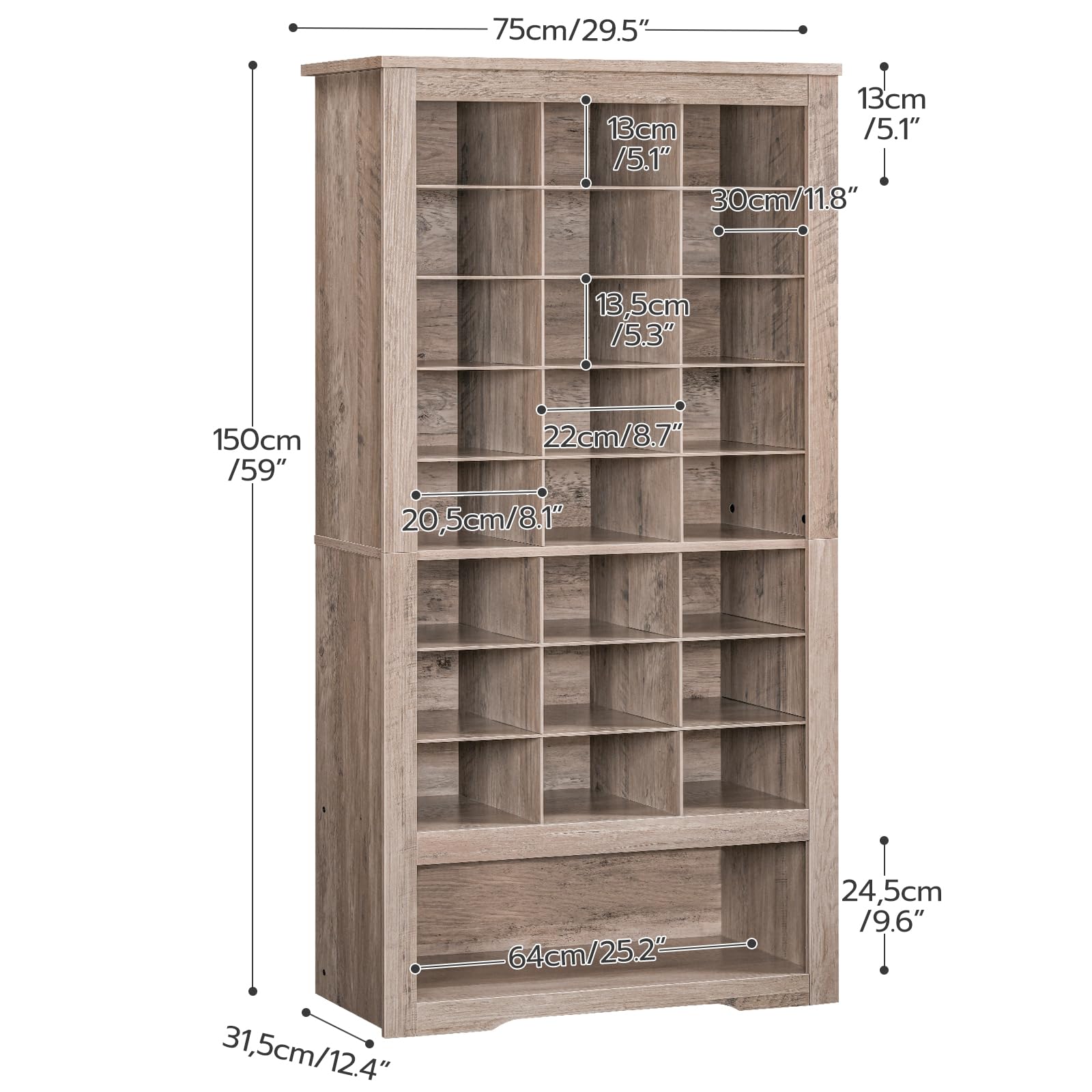 - Space Saver: Sized at 29.5"L x 12.4"W x 59"H, the sleek shoe storage cabinet with vertical design blends seamlessly into any space whether in entryway, living room, bedroom, or closet. It maximizes vertical storage in a narrow space to keep your collection in order