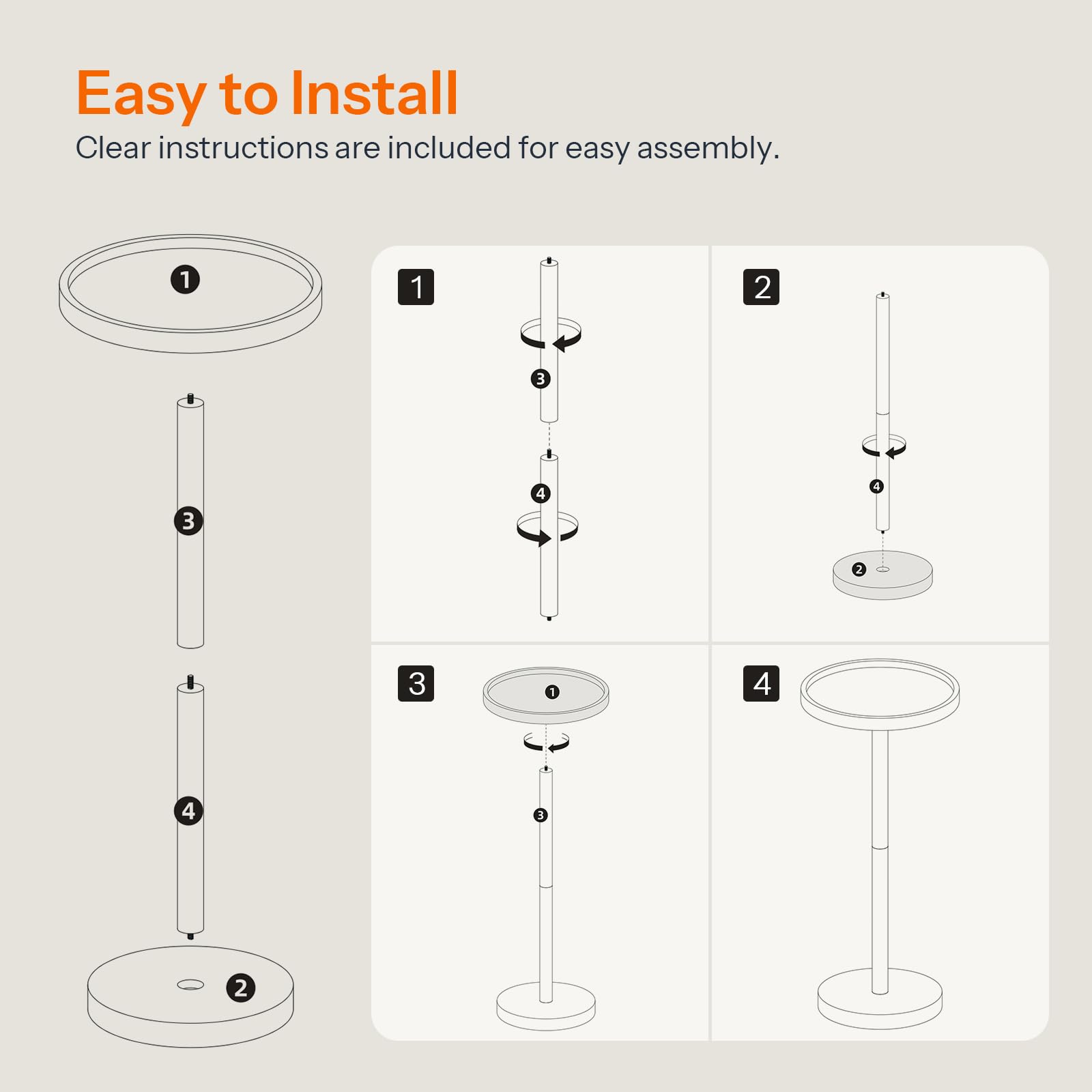 - Tool-Free Easy Assembly: Featuring a twist-lock structure and clear illustrated instructions, this small round end table assembles quickly without tools. Just a few simple twists, and it’s ready to use.