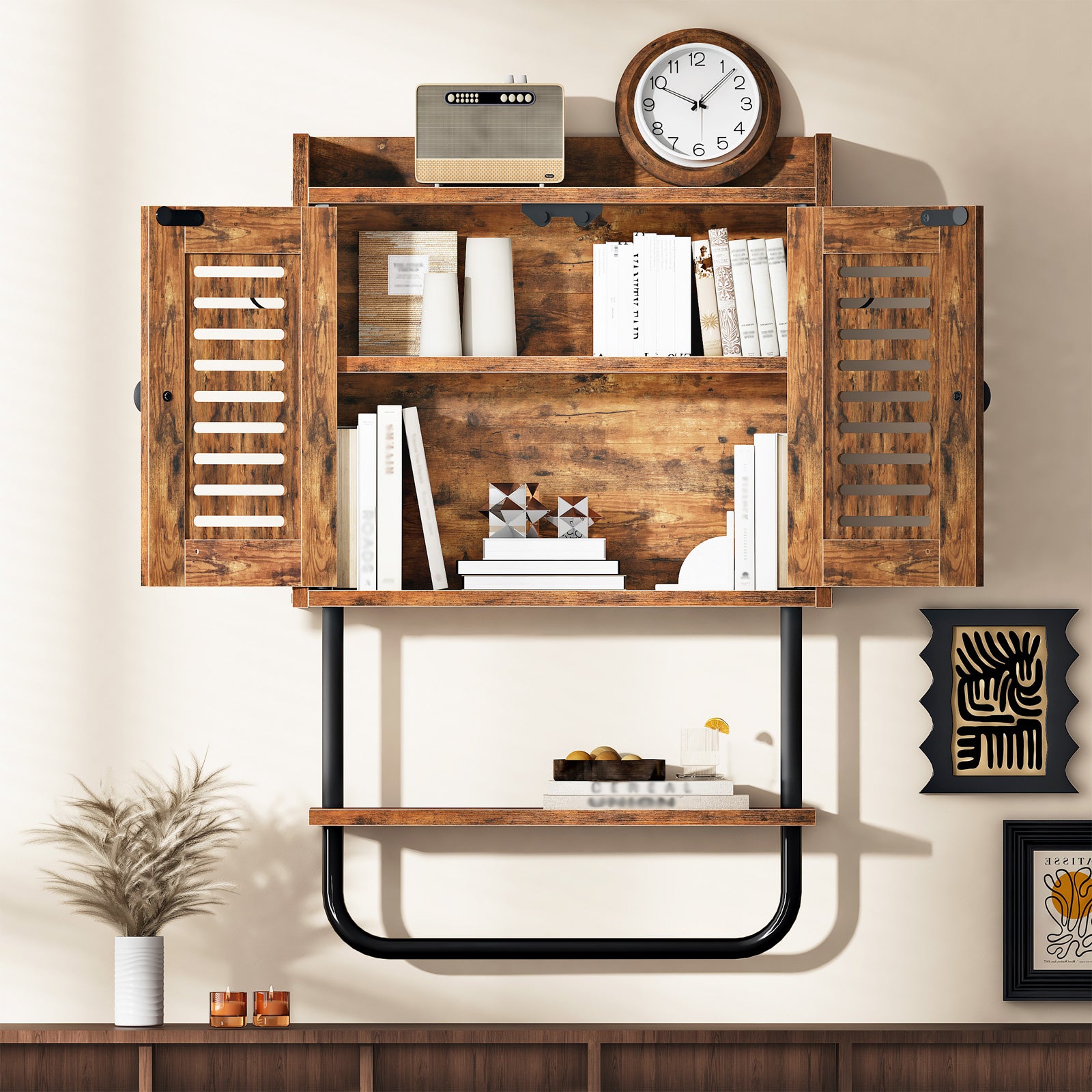 - Vintage Design, Clever Decoration: This wall-mounted bathroom vanity cleverly combines classic natural wood brown with sophisticated black metal. Its retro louvered doors balance ventilation and visual appeal, making enclosed storage both convenient and aesthetically pleasing. The spacious top countertop is the perfect stage for displaying aromatherapy products, plants, or decorative items, infusing your living space with natural vitality and artistic style.