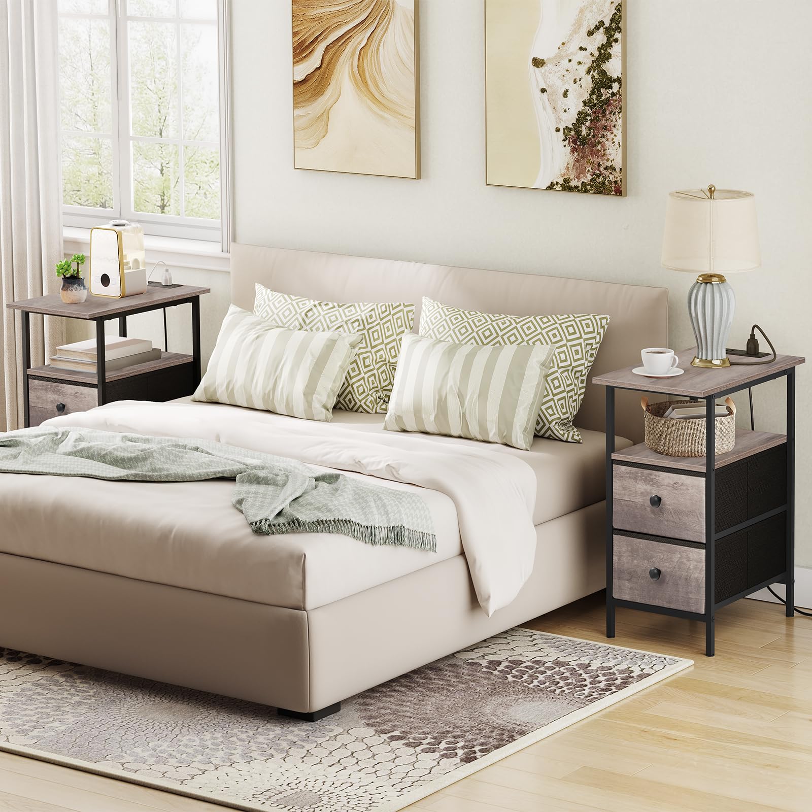 - Clutter-Free Storage Solution: Designed with two fabric drawers and two open shelves, this compact side table provides flexible space for daily essentials and small electronics. Measuring 11.8"L x 18.9"W x 23.6"H, it helps keep everything within reach while maintaining a tidy living area.