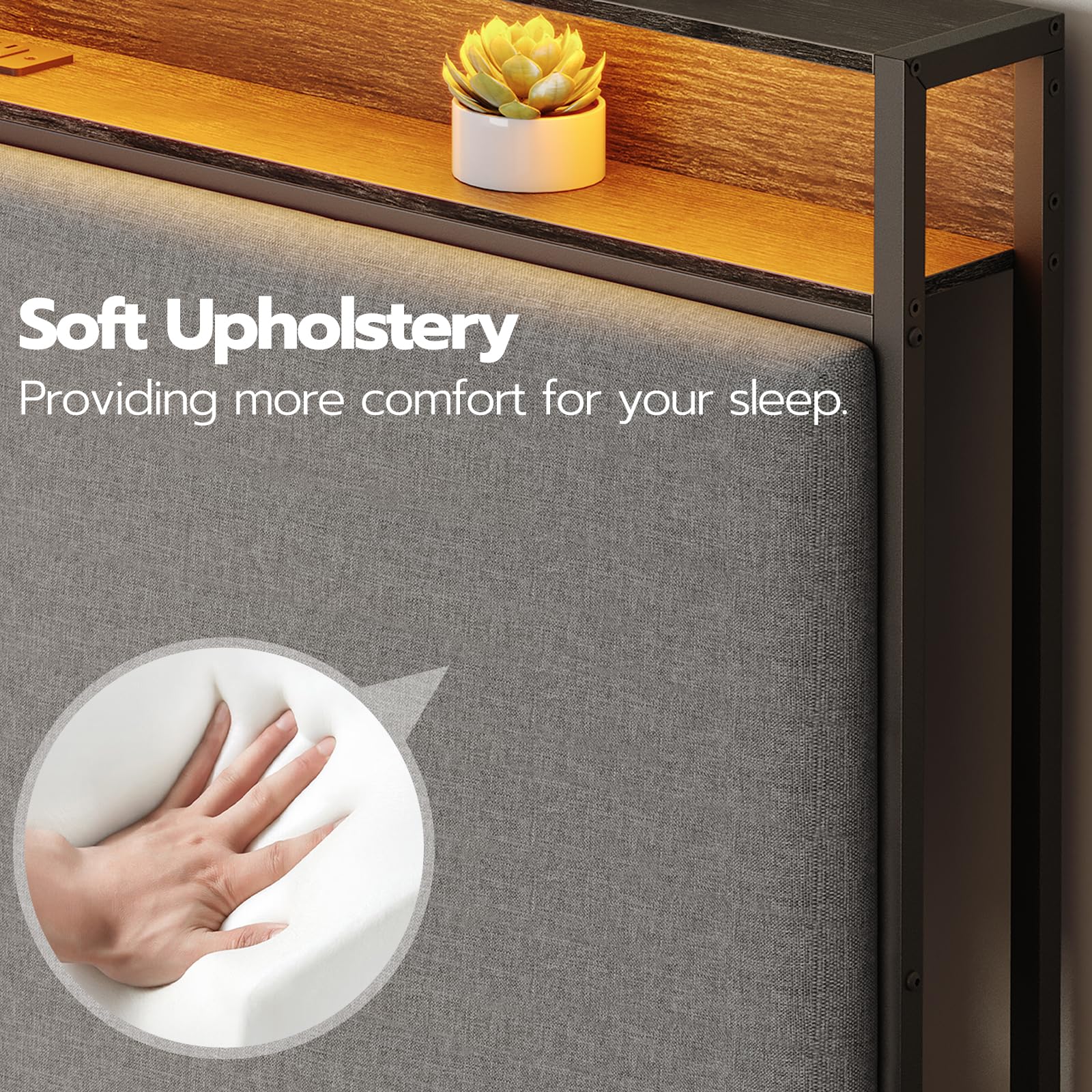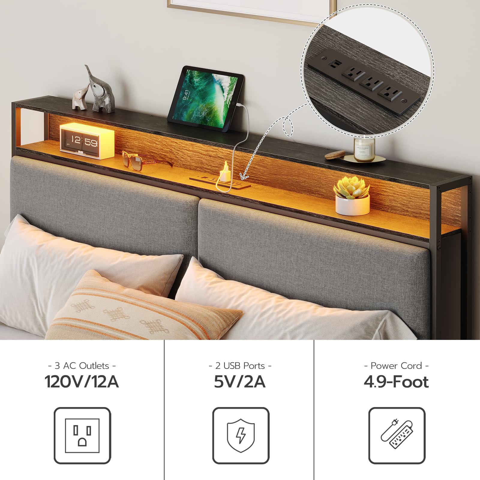 - Convenient Charging Station: The headboard comes with 3 AC outlets and 2 USB ports, allowing you to charge multiple devices simultaneously—phones, tablets, or other electronics—without reaching for wall sockets.