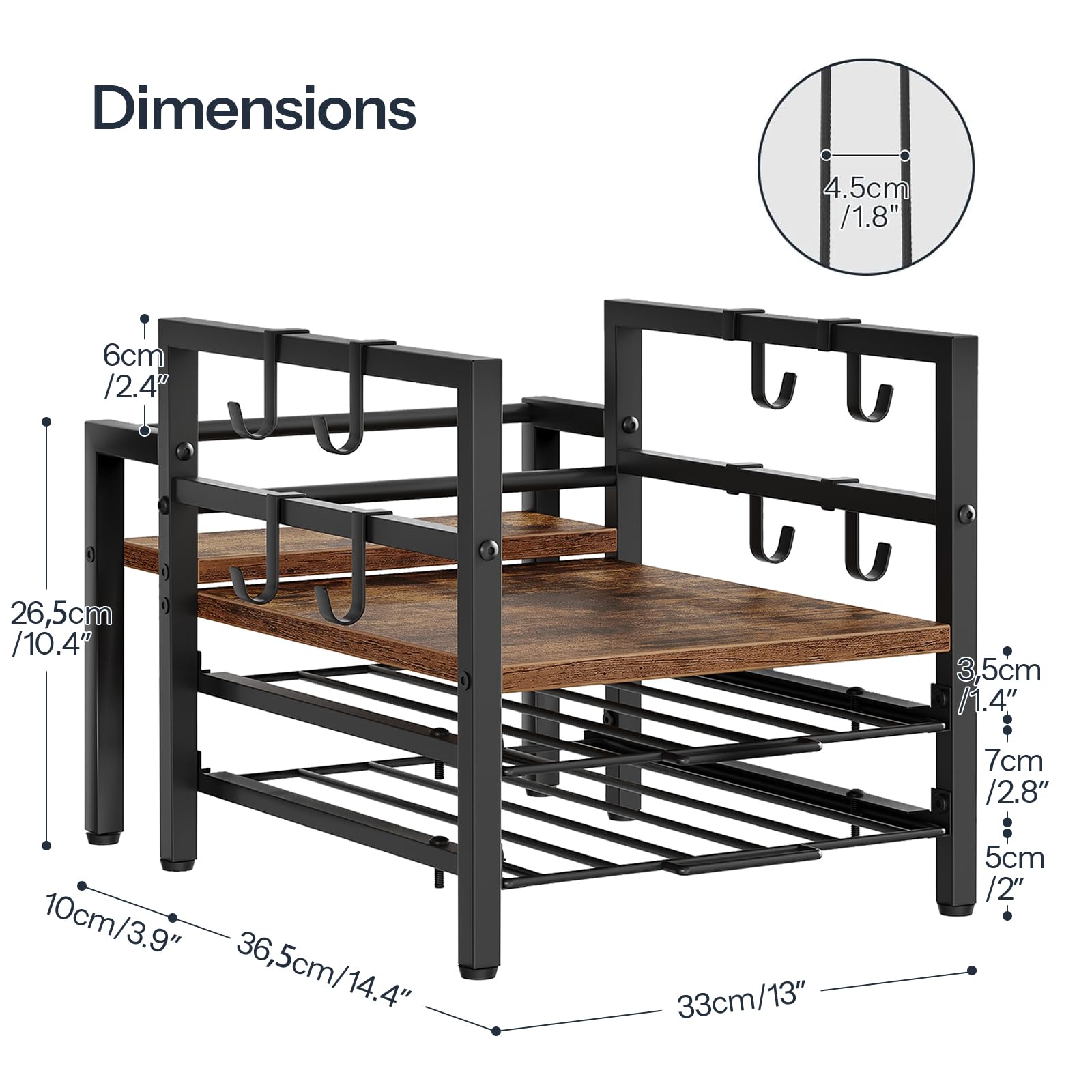 - Coffee Pod Holder with Versatile Storage Rack: The top holds the coffee machine, while the back shelf is ideal for storing syrups and cups, complemented by 2 metal sliding drawers for k cup holder and 8 movable hooks for convenient mug hanging, ensuring optimal space utilization