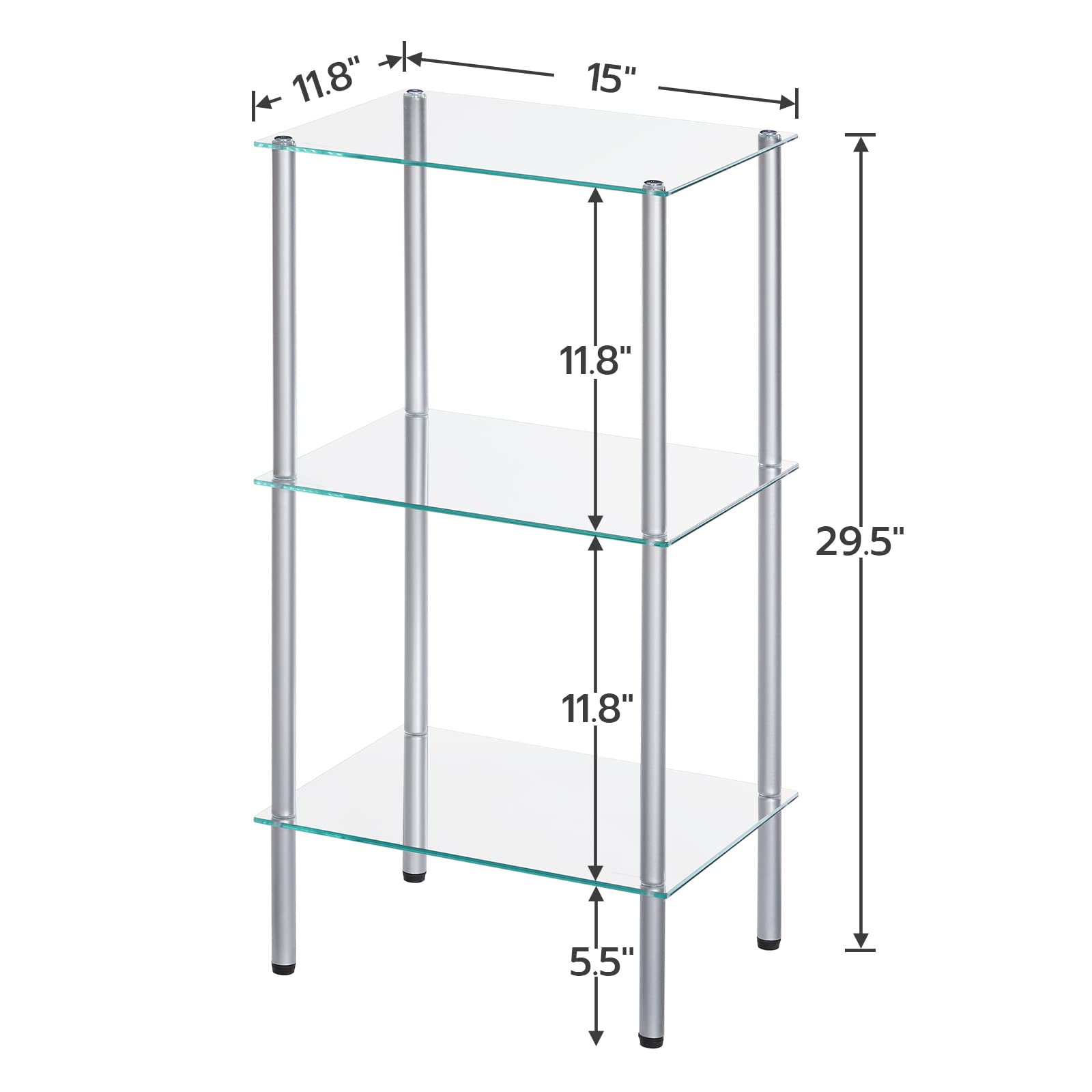 - Large and Practical: This is a bathroom shelf of 15" in length, 11.8" in width and 29.5" in height that occupies a small footprint, very ideal for tight spaces. Whether it's toiletries and towels, ornaments or miscellaneous items, glass shelves can organize them all, bringing a neat and tidy atmosphere to your space