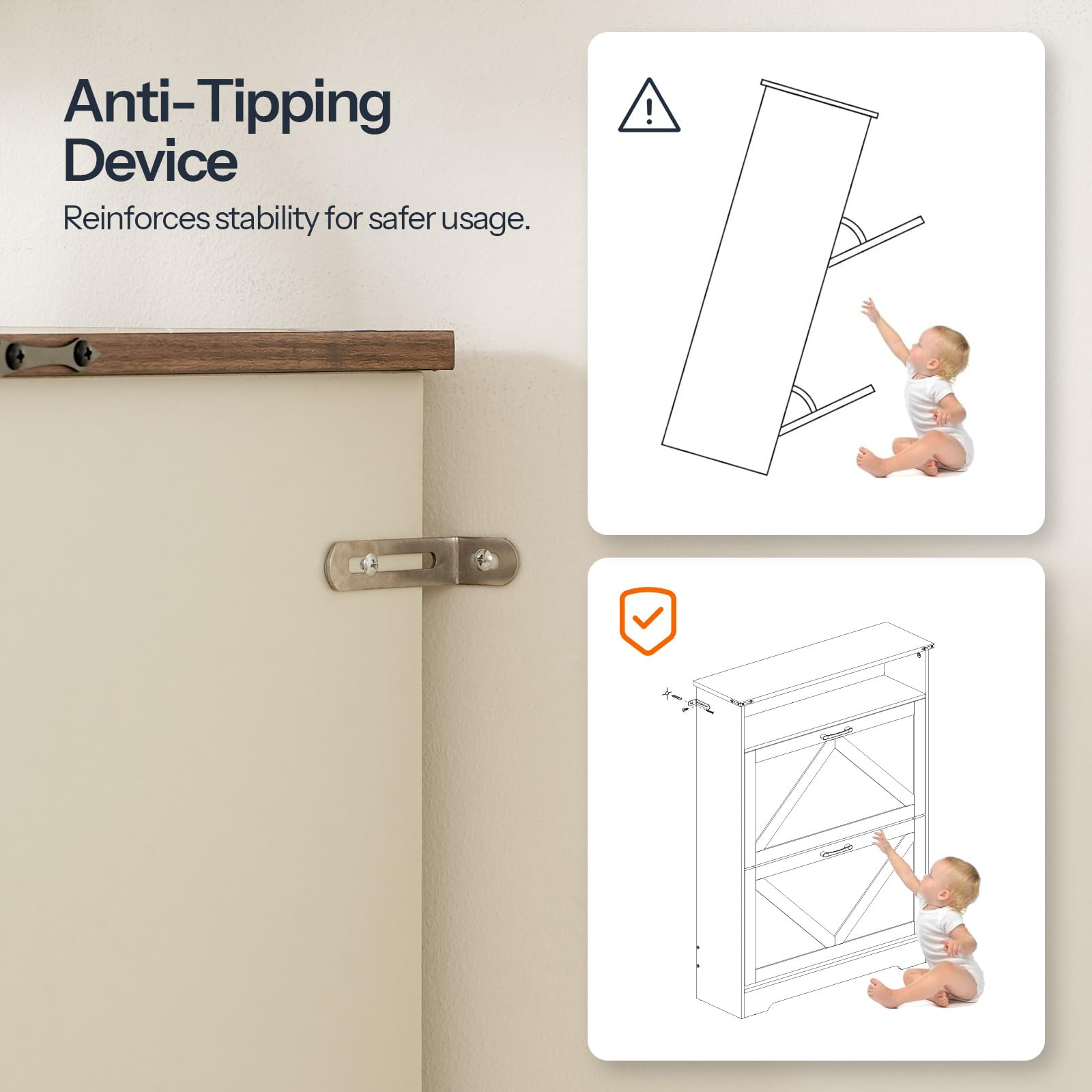 - Reliable Durability: Made of premium particleboard, the top of this hidden shoe organizer supports 44 lb, and each drawer shelf handles 11 lb. Use the anti-tip hardware to secure it against the wall, preventing tipping accidents and protecting your family