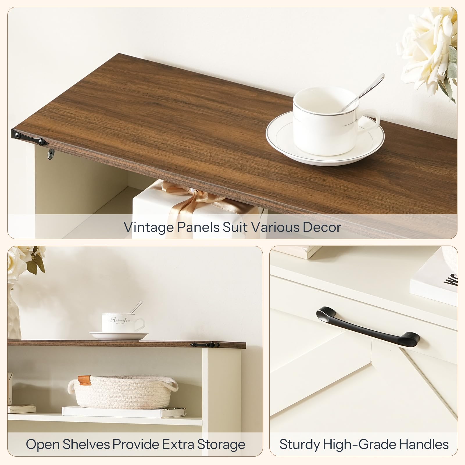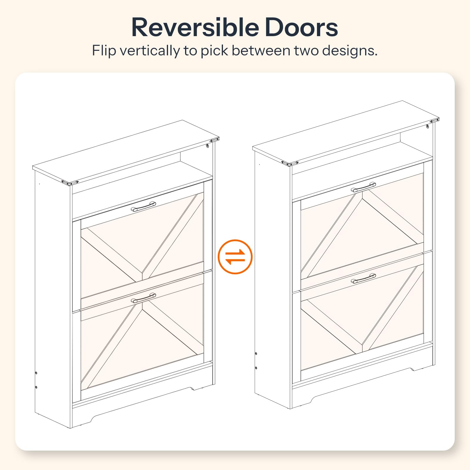 - Versatile for Any Decor: Featuring a warm white body with a walnut top, this wooden entryway shoe cabinet complements a diverse range of interior styles, making it a standout home accent. Reverse the two doors for two unique patterns—both beautiful and useful